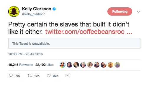 When one commenter wrote, in a since-deleted tweet, that she didn’t “like” that part of Obama’s speech. Clarkson had this to say: “Pretty certain the slaves that built it didn’t like it either.”