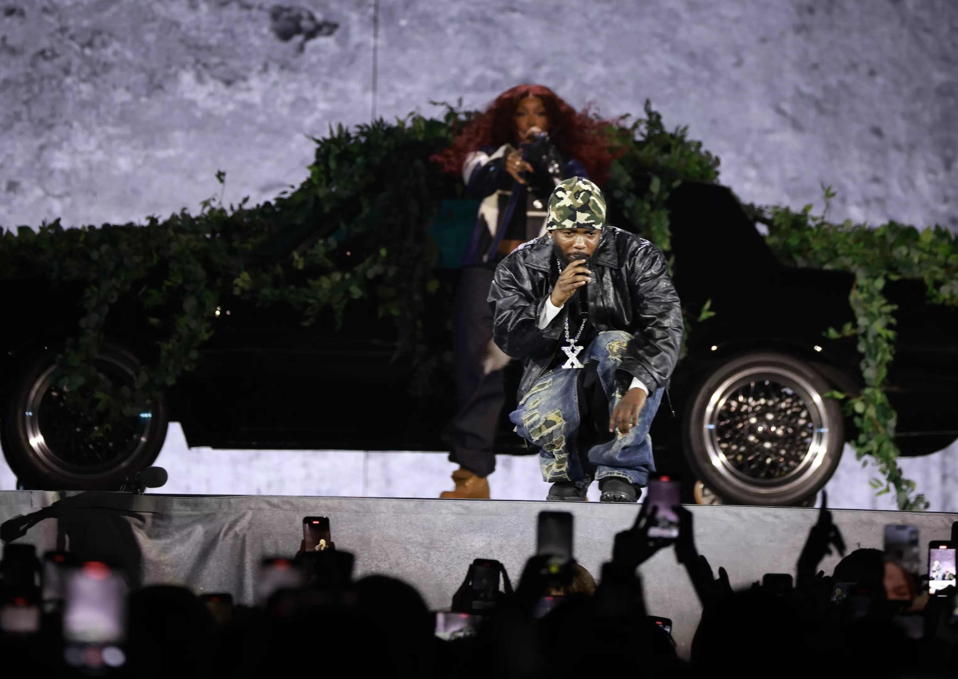 SZA sat on the GNX, draped in vines and greenery, with backup dancers who show more free-spirited individuality than Lamar’s dancers of militant uniformity. Lamar and SZA work as twin flames. While he is more intense with his rapping, SZA is passionate yet relaxed. In their “30 for 30” performance, their chemistry was recognizable from jump. SZA took over the show, warming us up with her crisp vocals as she did “Love Galore,” “Broken Clocks” and “The Weekend.” A quick crowd scan shows their fan bases are split down the middle, equally excited to see them do songs together and apart.