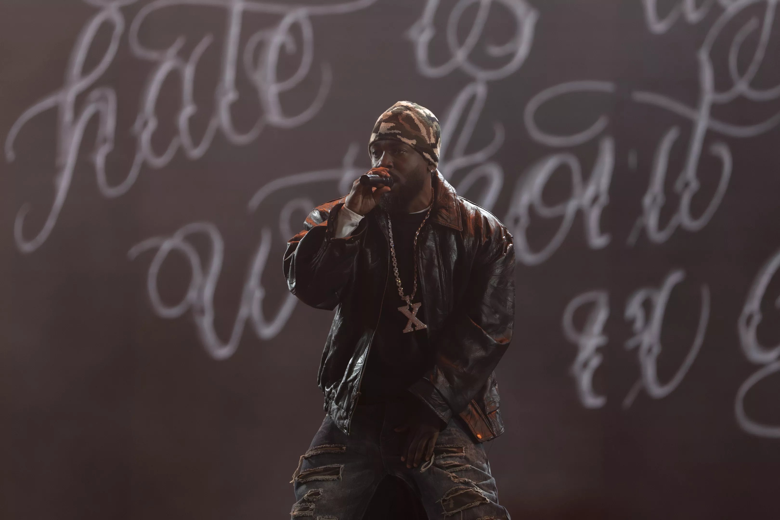 A Buick Grand National is packed with horsepower, and you could compare Lamar’s stamina behind the mic to his current car of choice. The show opened with footage of him being deposed and a GNX doing doughnuts. Then you hear mariachi singer Deyra Berrera’s voice and her Spanish lyrics splash on the black screen. It’s the beginning of “Wacced Out Murals,” and Lamar is rapping inside the GNX as it rises from the stage. The GNX does a burnout before Lamar exits. He’s locked in. We’re off to the races.