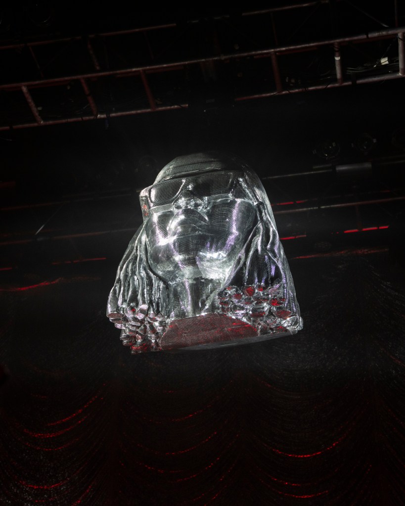 At 8:58 p.m., the white stage lights snapped on, revealing classic silver, sparkling Hollywood curtains, two silver risers for the band, four silver, glittering pillars framing the set and a chrome sculpture of Thomas’ head floating above, reminiscent of a disco ball.