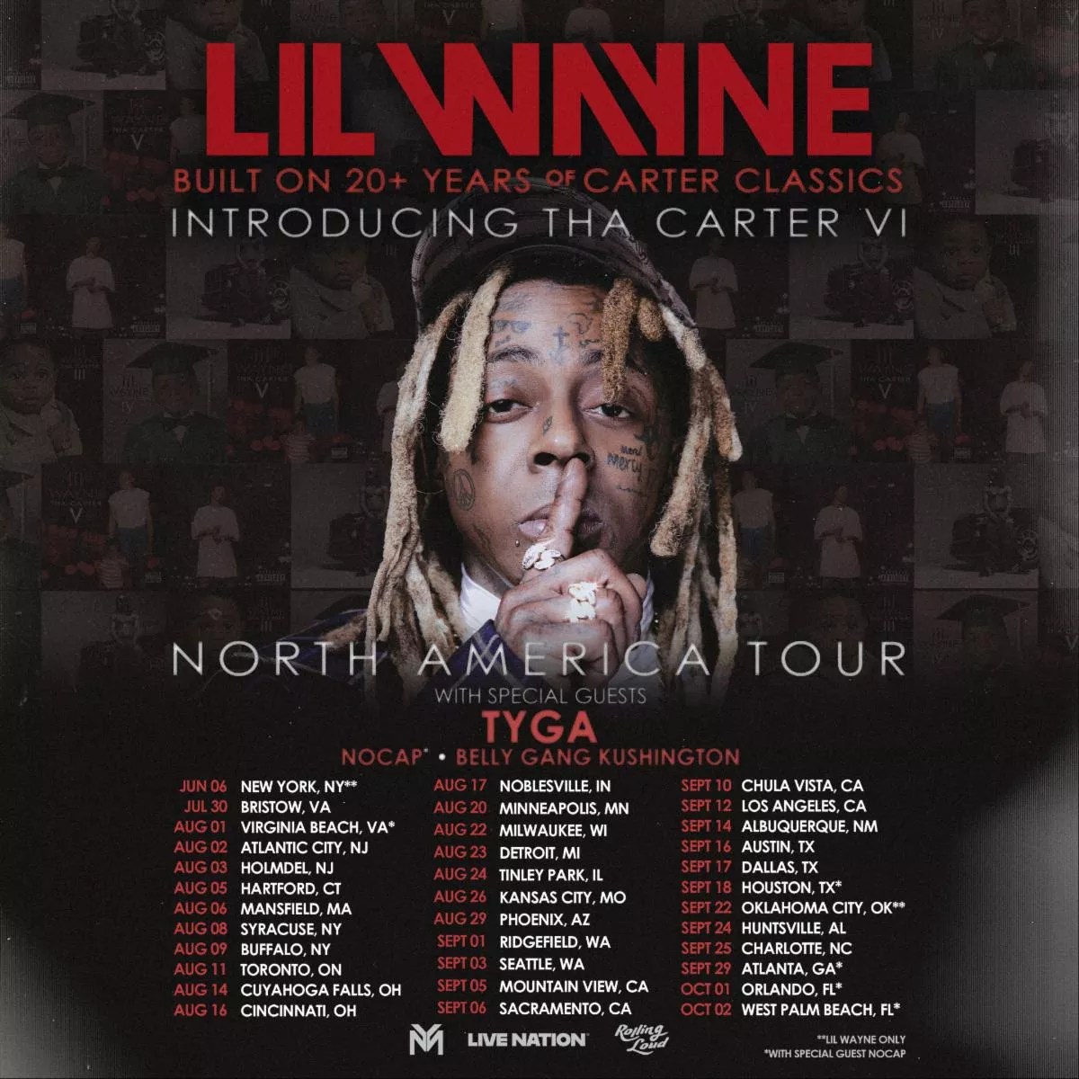 On June 6, Lil Wayne is dropping the sixth installment of Tha Carter. For this one, the cover artwork is the same as how he’s been doing it since Tha Carter III, featuring a babyface Weezy with a bunch of face tattoos. To coincide with Tha Carter VI release, he’ll be going on tour celebrating over 20 years of Tha Carter series, with special guests Tyga and Belly Gang Kushington. He’ll be coming to Dallas on Sept. 17 at Dos Equis Pavilion and general admission tickets are available here. Full tour dates are below:
