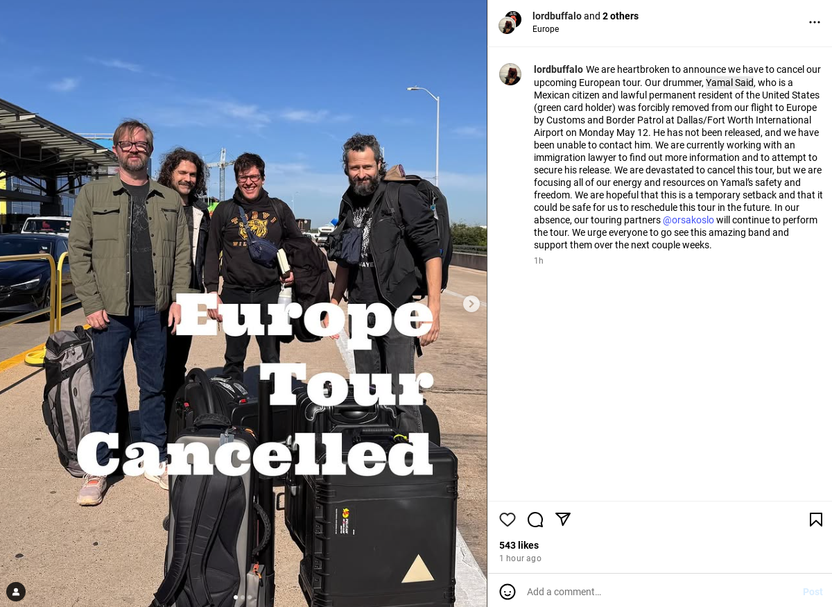 “We are heartbroken to announce we have to cancel our upcoming European tour,” the band wrote. “Our drummer, Yamal Said, who is a Mexican citizen and lawful permanent resident of the United States (green card holder) was forcibly removed from our flight to Europe by Customs and Border Patrol at Dallas/Fort Worth International Airport on Monday May 12. He has not been released, and we have been unable to contact him.”