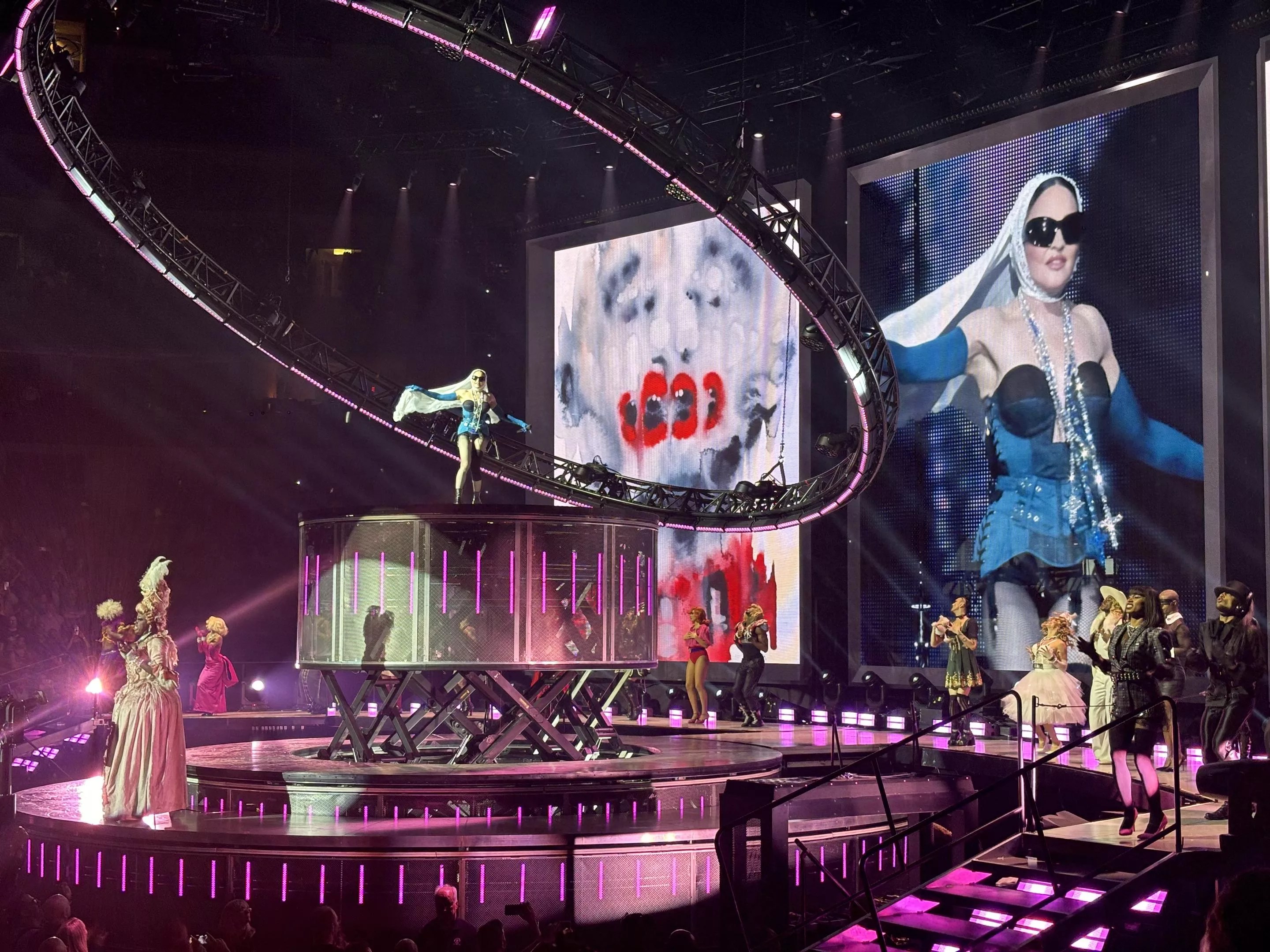 A sound of tolling bells then came from behind the screen. A circle of crosses rotated with dancers in each compartment, hanging at times as if crucified. Madonna walked around the stage’s ramp with her head covered, along with dancers dressed as priests. The intro to the Sam Smith/Kim Petras hit “Unholy” lead to “Like a Prayer” as the stage’s floor lit up as if on fire.