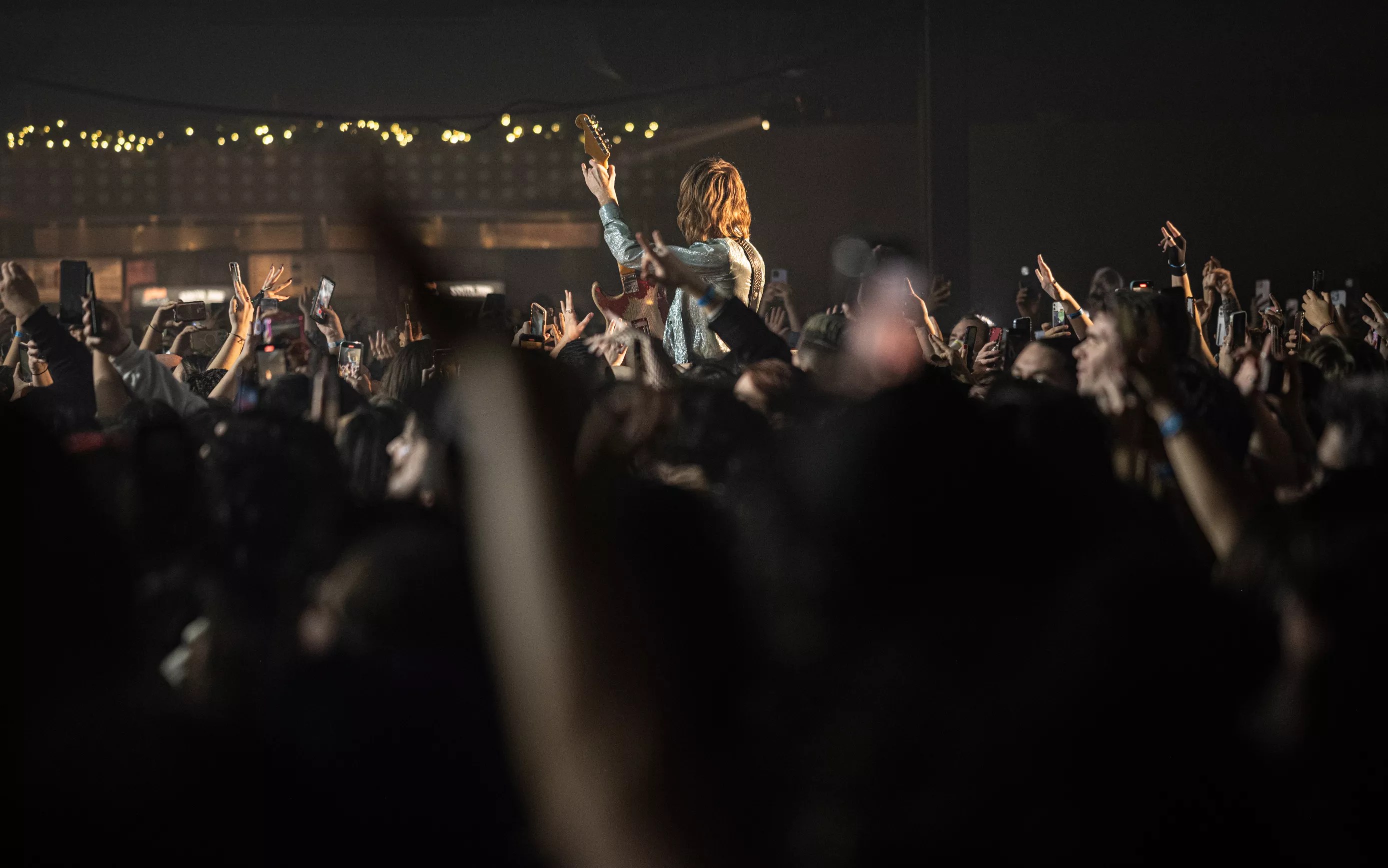 The show had been building. Until the encore, it was two hours of high energy. We’re not sure how much a custom Gucci shirt costs, but by the middle of the set, only bassist Victoria De Angelis was wearing one. All the band members sans drummer Ethan Torchio had taken turns crowd-surfing, and for the last song they were joined onstage by a couple dozen folks in the crowd who had scored special wristbands. The set came to an end in a pyramid of raised hands, cell phones, huge smiles and awkward dancing.