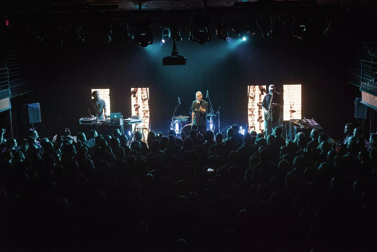 At various points throughout the show, Griffin played the melodica, a flute-length keyed wind instrument. But the trumpet was noticeably absent from the set. That’s one of the instruments Griffin played in the local band the Telefones, before breaking off into his solo career. The instrumental heavy-lifting was done by Chris McGuire on altosax, Greg Beck on drums and Wanz Dover on an assortment of instruments including synths, computers and turntables.