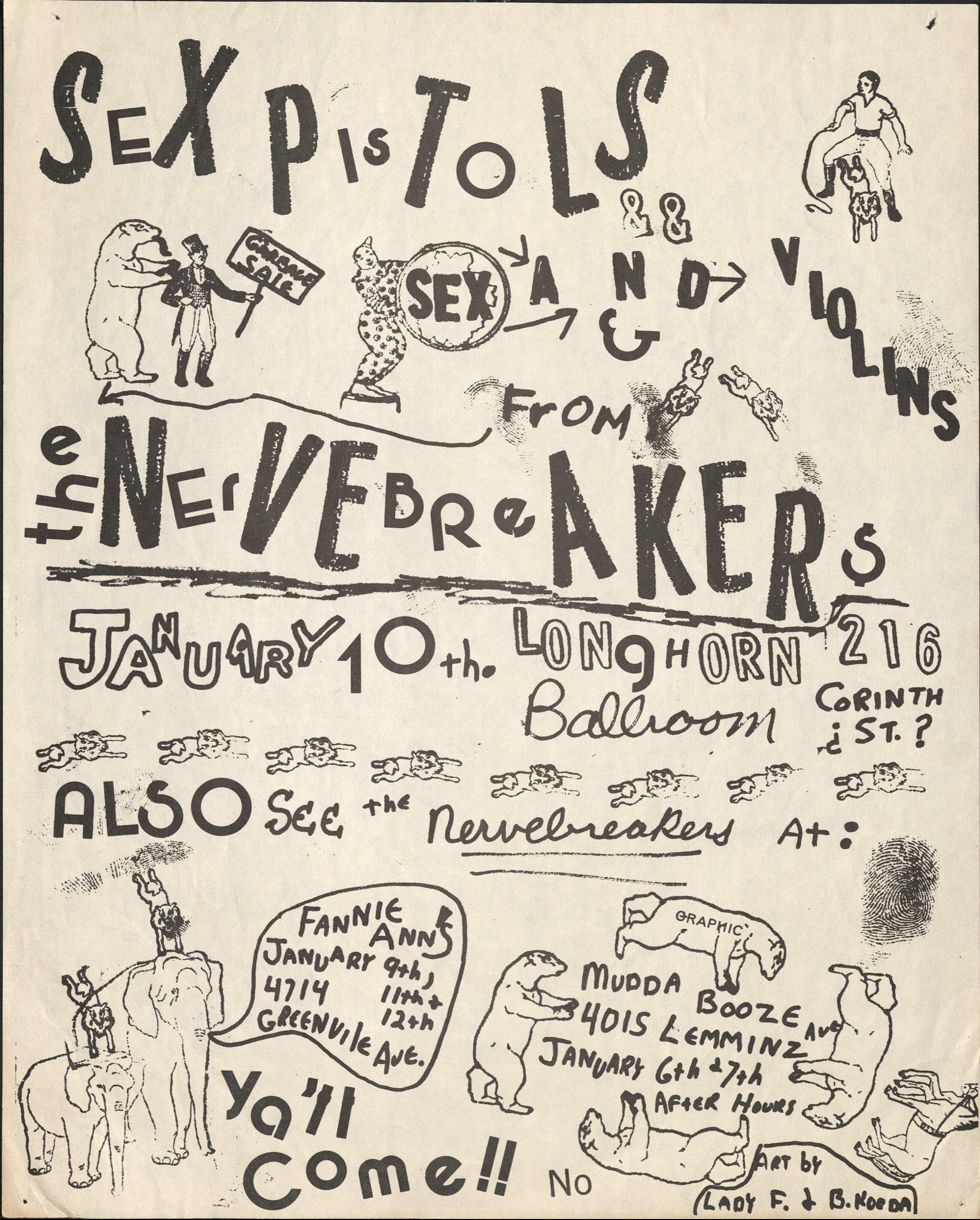 “The graphics were absolutely essential, and … posters and flyers became essential extensions of the core graphical work, the [record] sleeve,” Krivine says. “This art form remains vital because, for me, I see the music and graphics as fused, impossible to disaggregate. Because music is an eternal art form, this is also true of the graphics.”