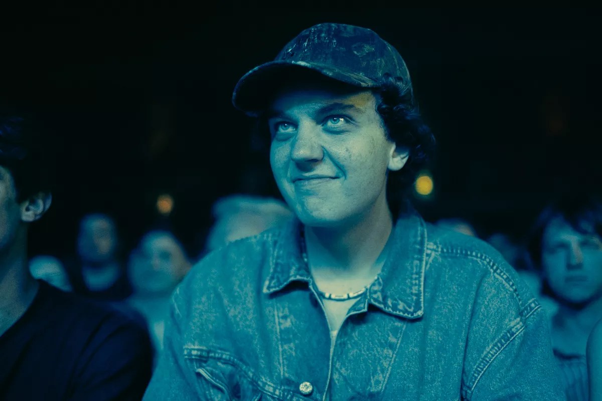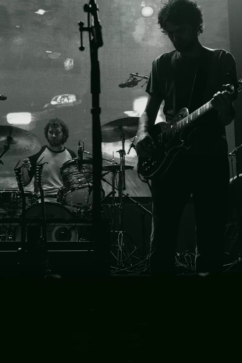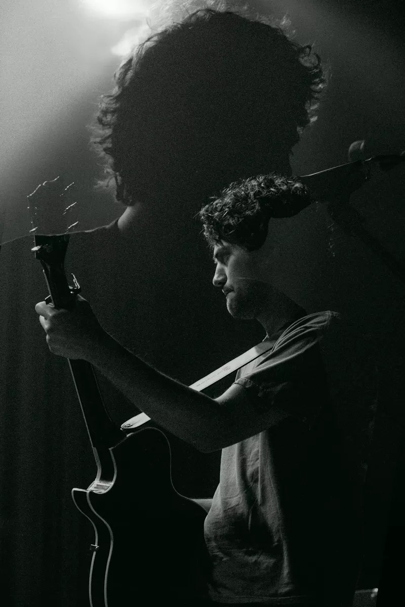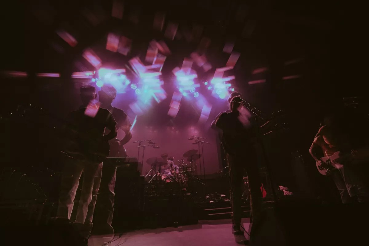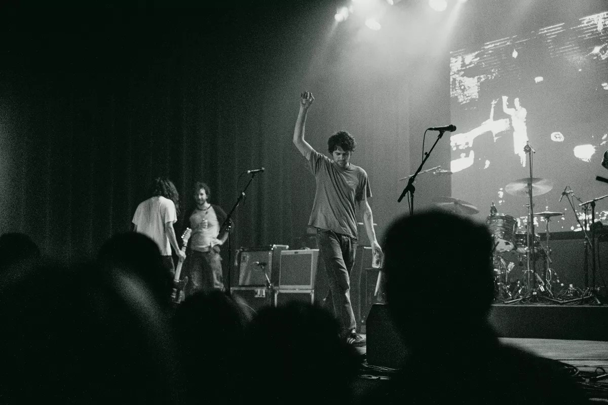 When it was time for the show to begin, Lenderman and the band shuffled onto a hazy stage, his and the features of the band melting into the atmosphere. He donned a t-shirt and jeans, looking much like the members of the crowd clad in workwear and patchwork tattoos themselves. A projection of art done in the style of the album cover, Manning Fireworks, was splayed out behind the band members. The tones of the band members in the low light against the painterly strokes of the projection turned the stage into a work of art.