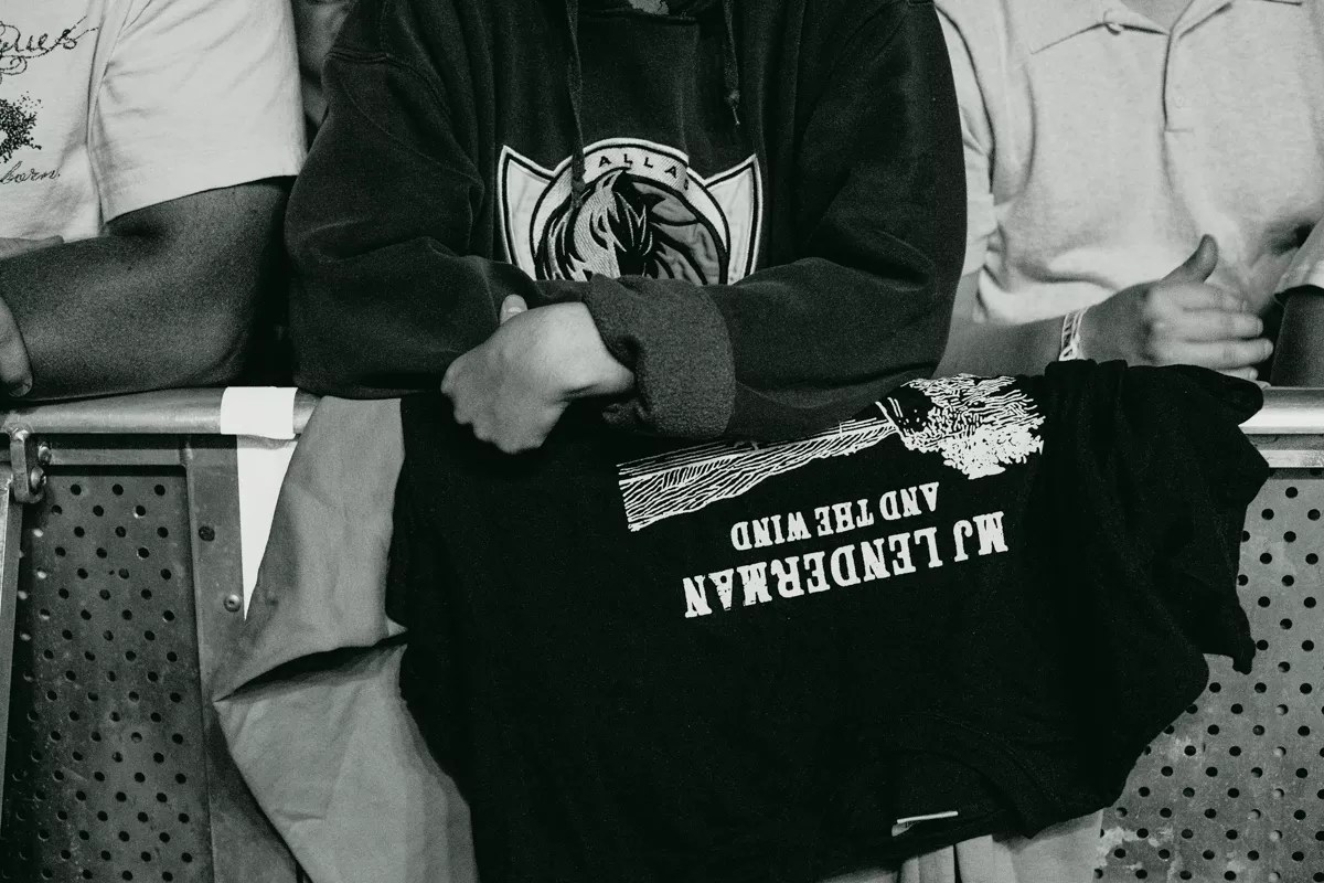 A crowd member holds onto some MJ Lenderman and the Wind merch at the barricade.