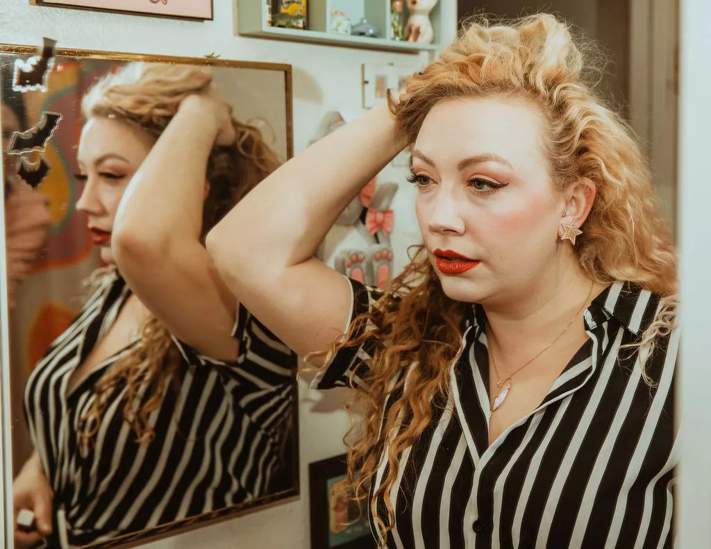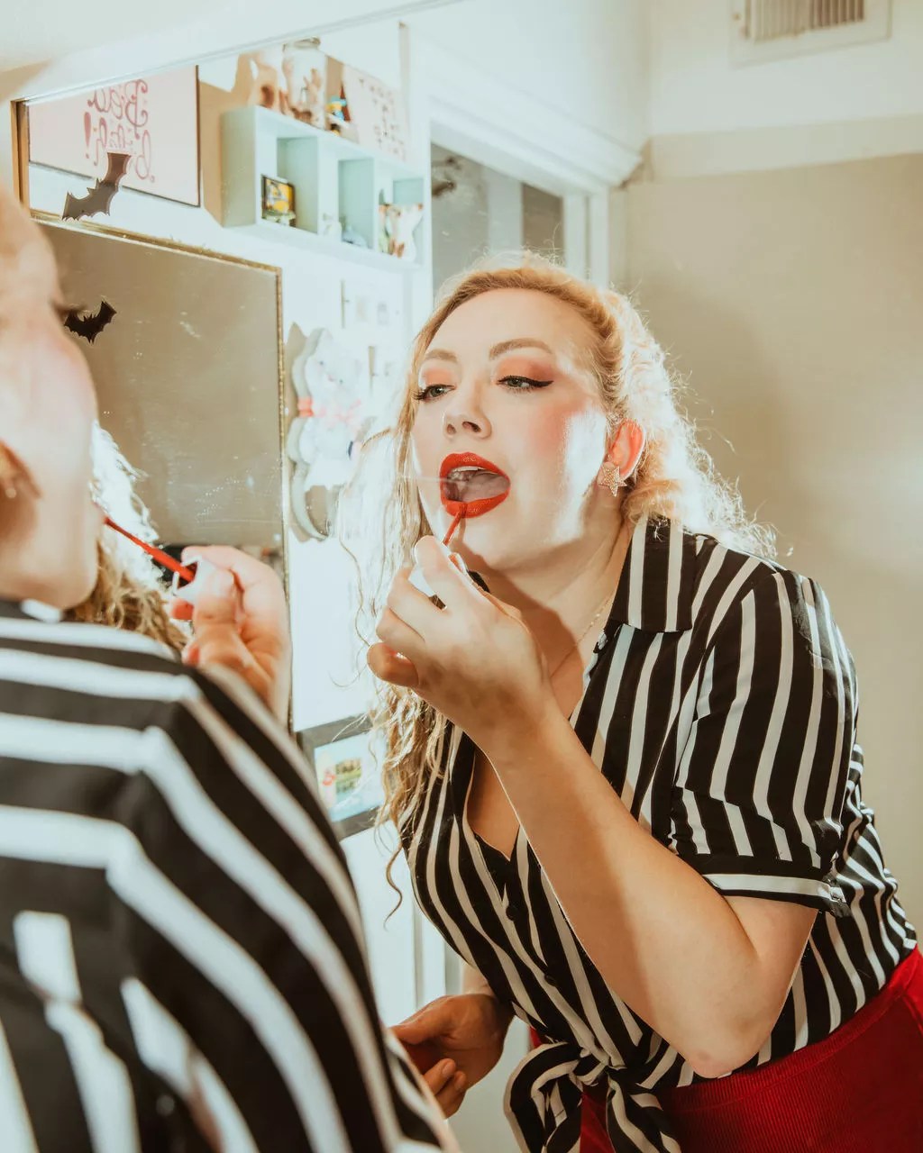 Deering takes a sip of her chai tea latte as we find a table at Jupiter House, a coffee shop in Downtown Denton, before heading back to her place, which has a highly saturated, maximalist bathroom and is the home of two adorable kitties. Deering is a self-proclaimed “overly feminine, cat-crazy girly-girl with a solid splash of punk rock.”