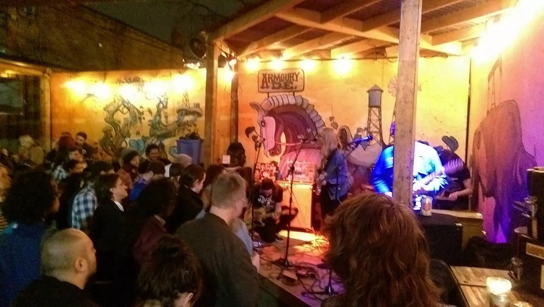 The patio is no less crowded. Nearly 70 people can fit in the outdoor space, and there are long wooden tables and bleacher style seating to accommodate the crowds, while a small dance floor is planted in front of the stage. Original art by Joseph Schaefer and surrealist murals by Dan Colcer grace its perimeters. Even when the temperature drops to the 40s, the patio is a pleasant place to catch a show thanks to industrial heat bars hovering above. They’re so powerful they melt lipstick.