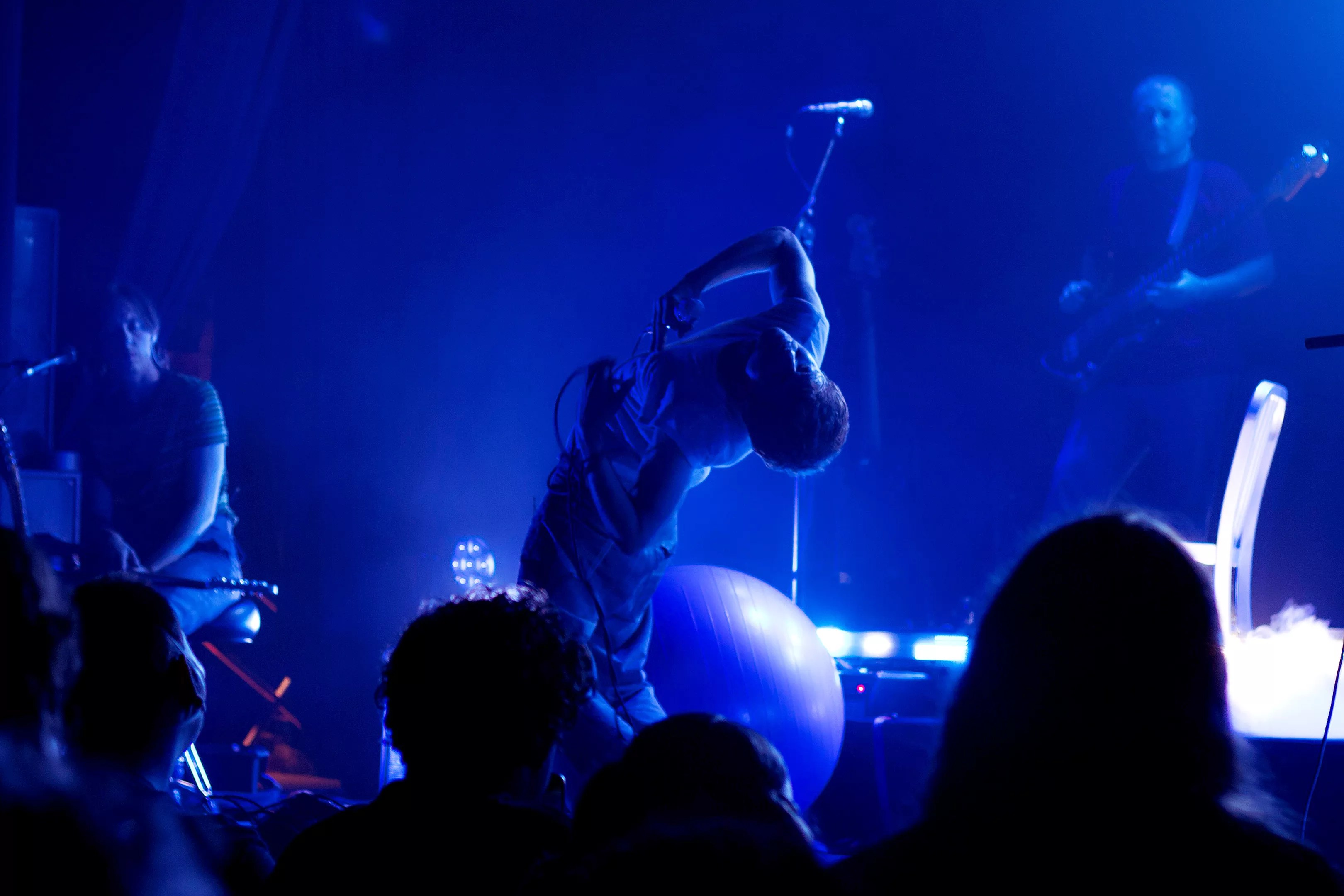 Opening with Glory‘s sinister, throbbing “In a Row,” Hadreas quickly established the bracing theatricality he would employ during his performance. Wreathed in darkness and smoke, Hadreas stood and slouched and slumped and slid from one side of the stage to the other, enlisting, at various points, the microphone cord, a chair, an inflatable ball, and a small rotating platform at center stage. He often seemed to vacillate between flailing and fighting, surrendering and striking back – a mix of postures as fluid as the melodies.