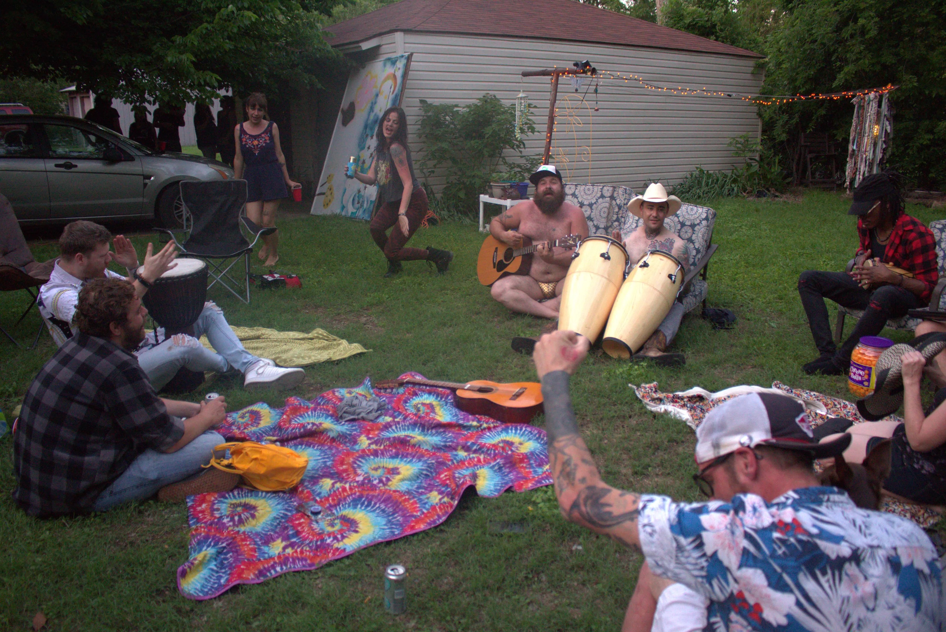 After the band arrives at the little backyard barbecue, guitar player Kyle Harper finds a nice spot on a blanket to rest his badly sunburnt body and sleep away some of the alcohol.