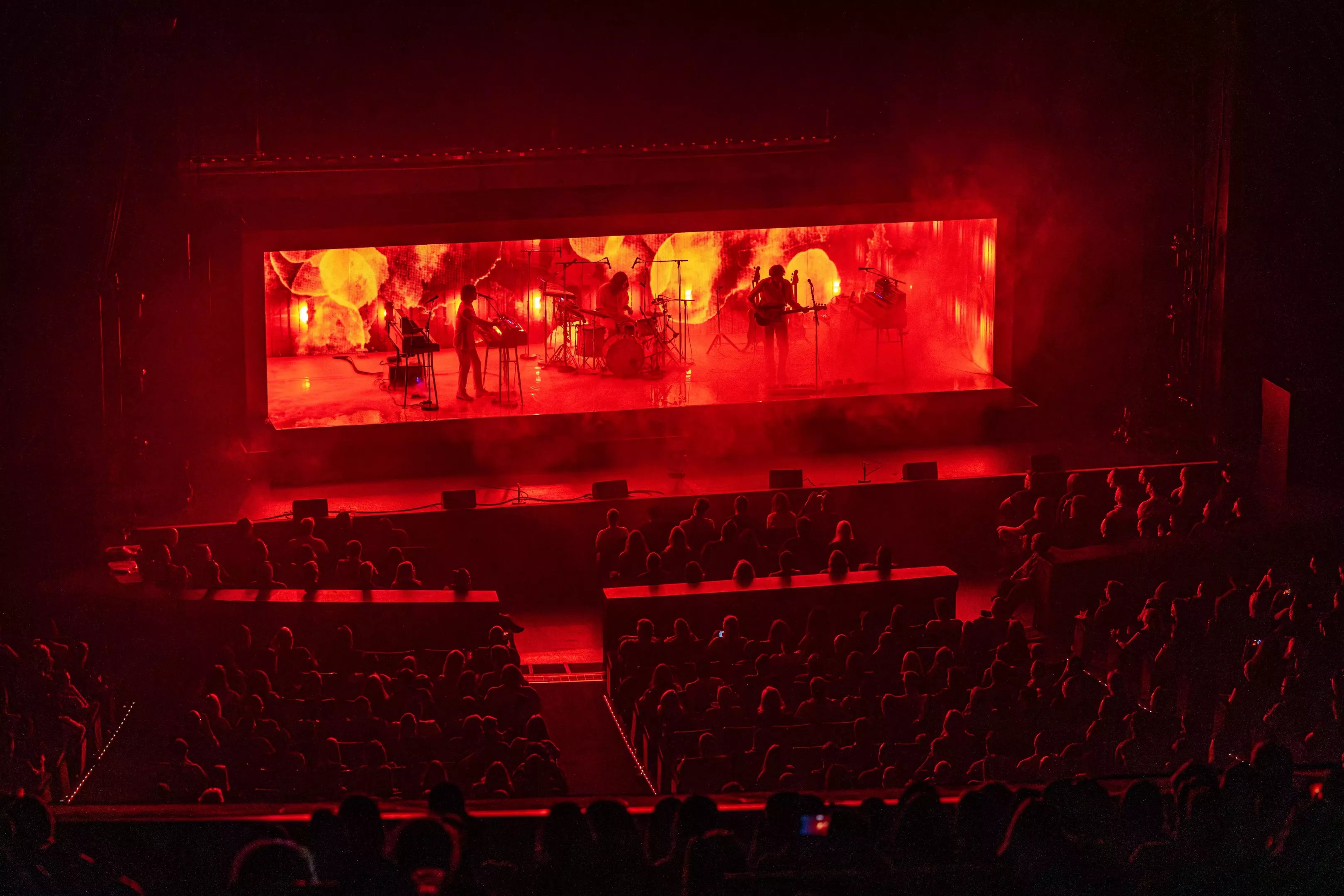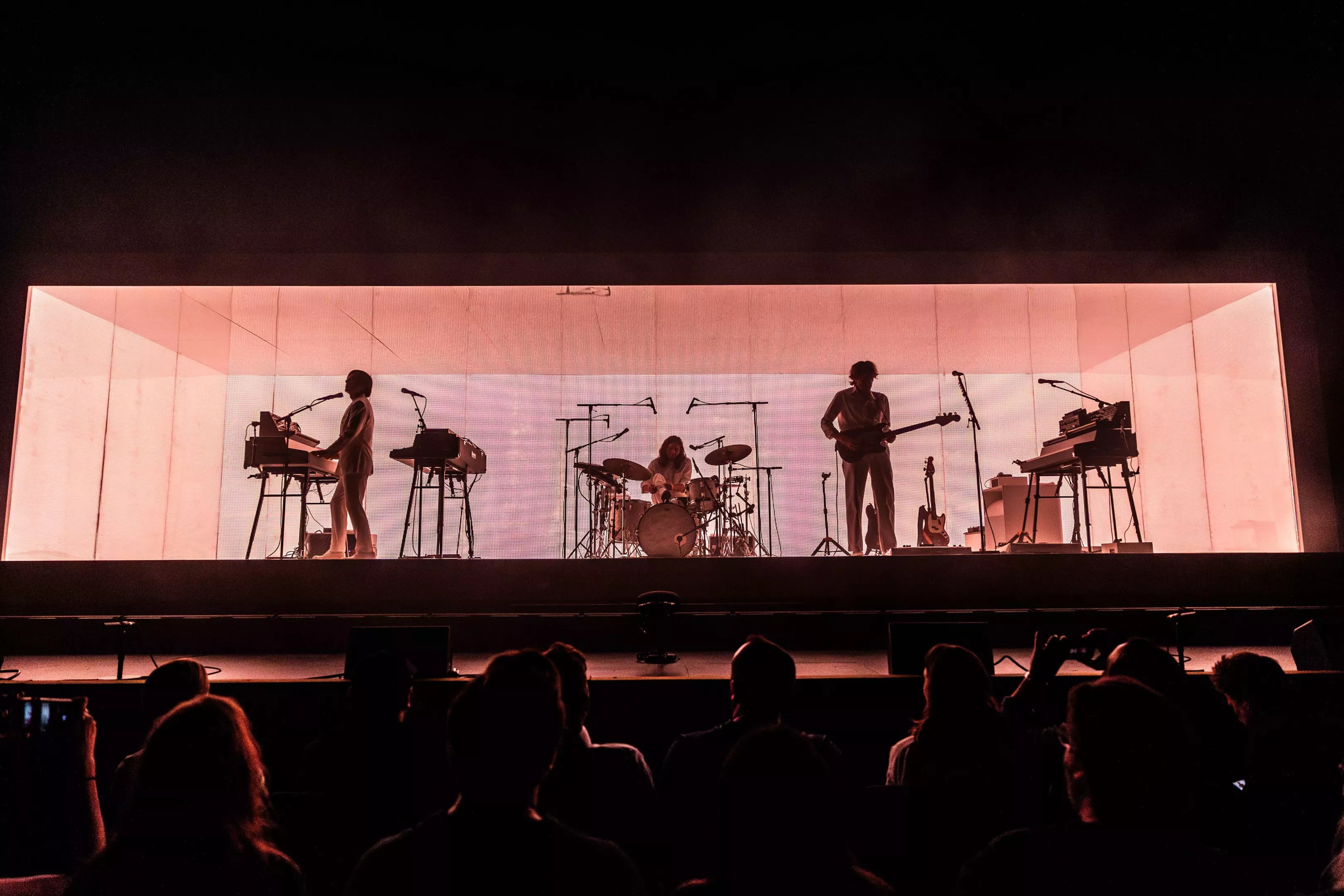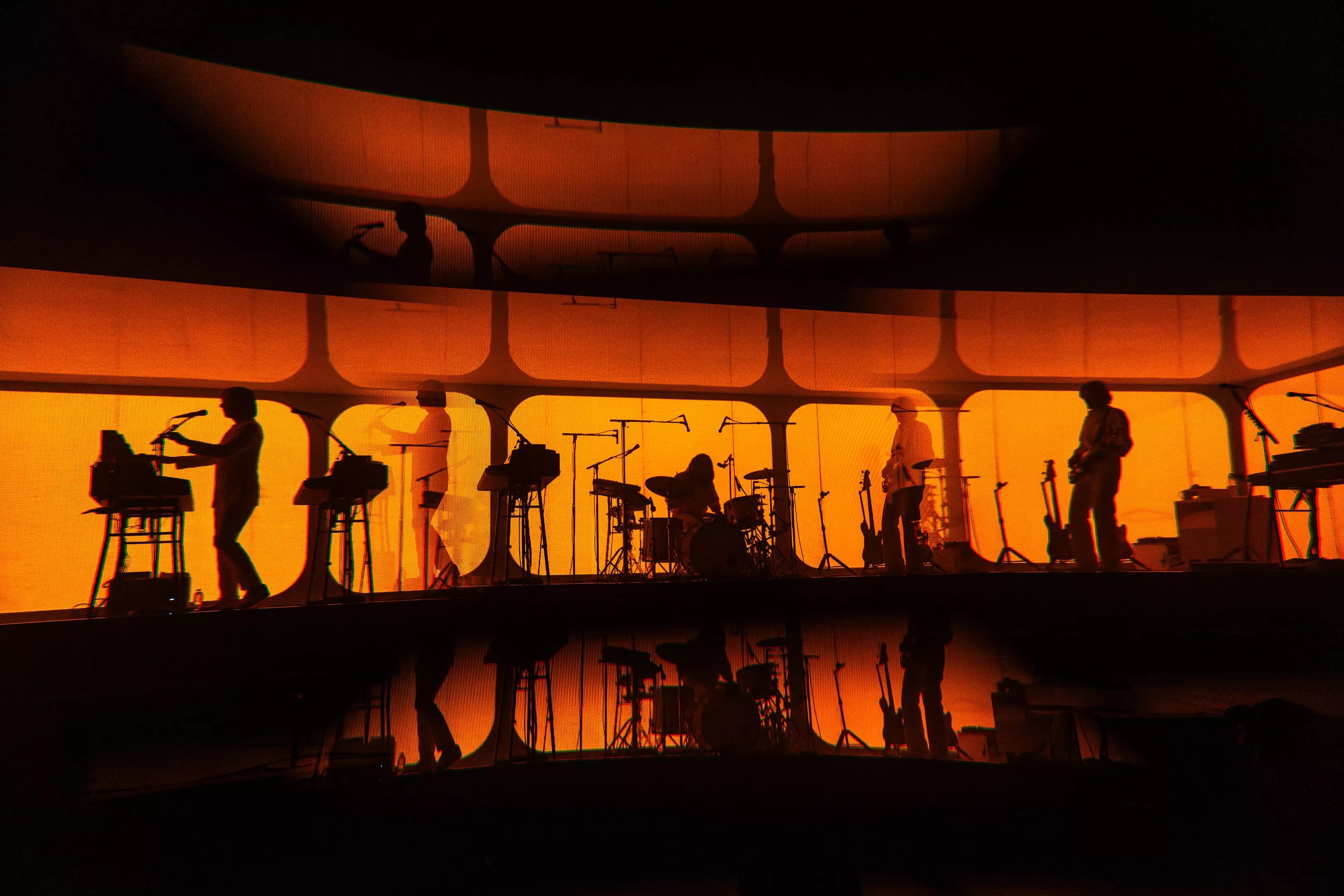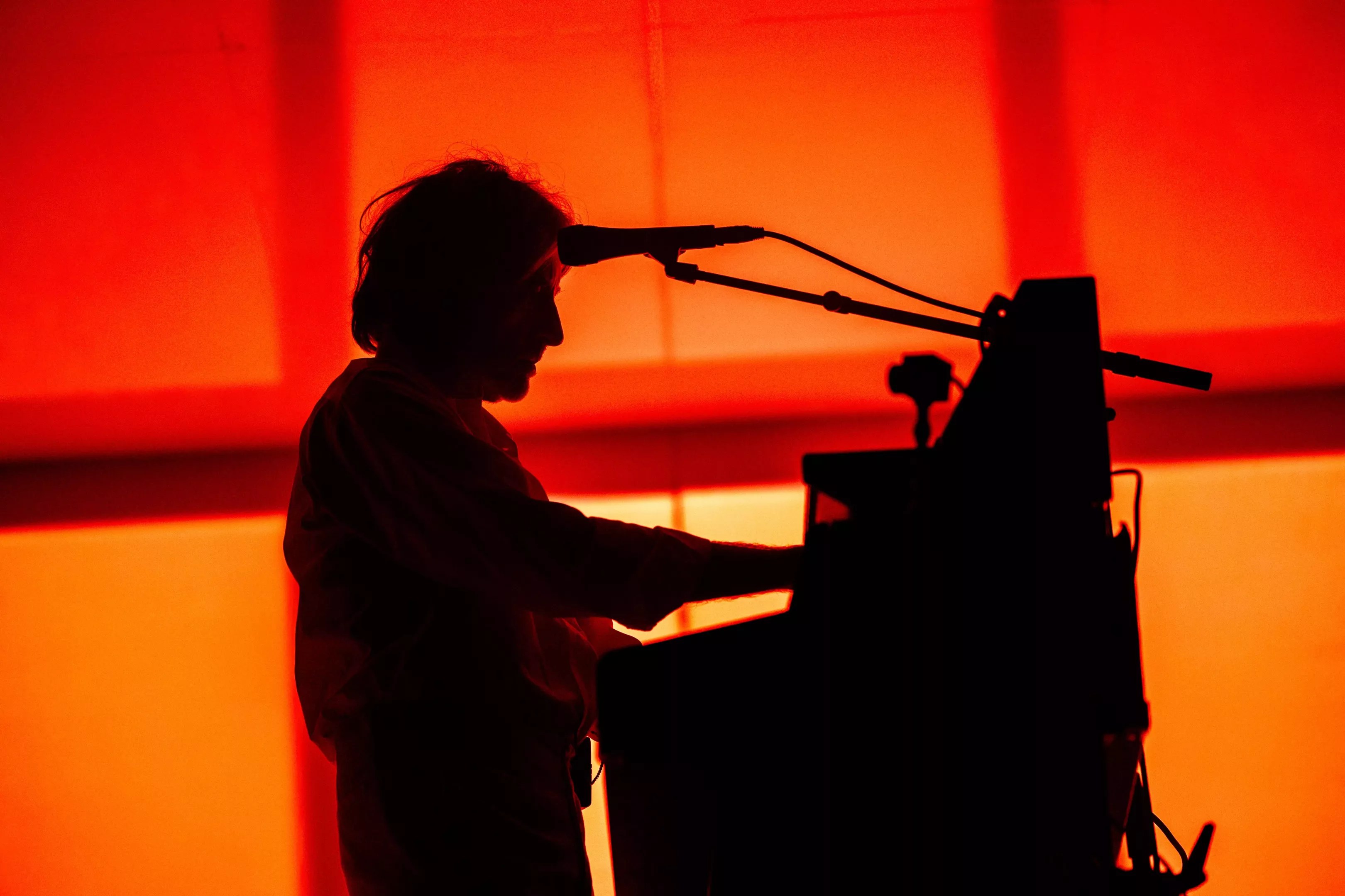 By squinching the band into such a confined space, the effect, early on, was almost like watching a movie happening live before you, amplifying the music’s cinematic tendencies. The musicians would move a little, but largely stayed put, flitting between synthesizers, electric pianos and other esoteric gadgets.