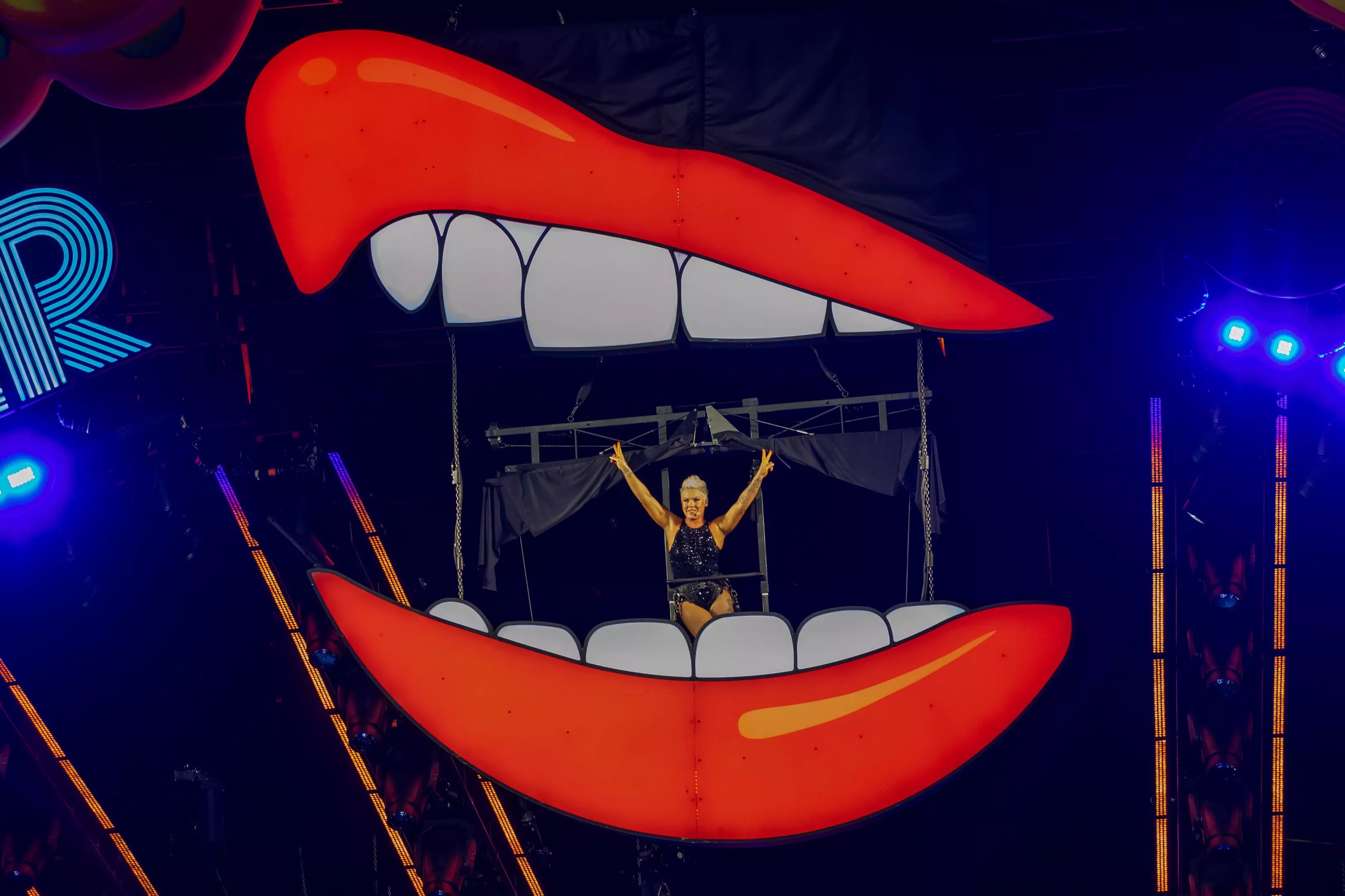 Seeing the interplay between Pink and her trio of backing vocalists as they sing an acapella intro to “Please Don’t Leave Me” adds depth and potency to all the sensory overload, giving it a more meaningful heft.