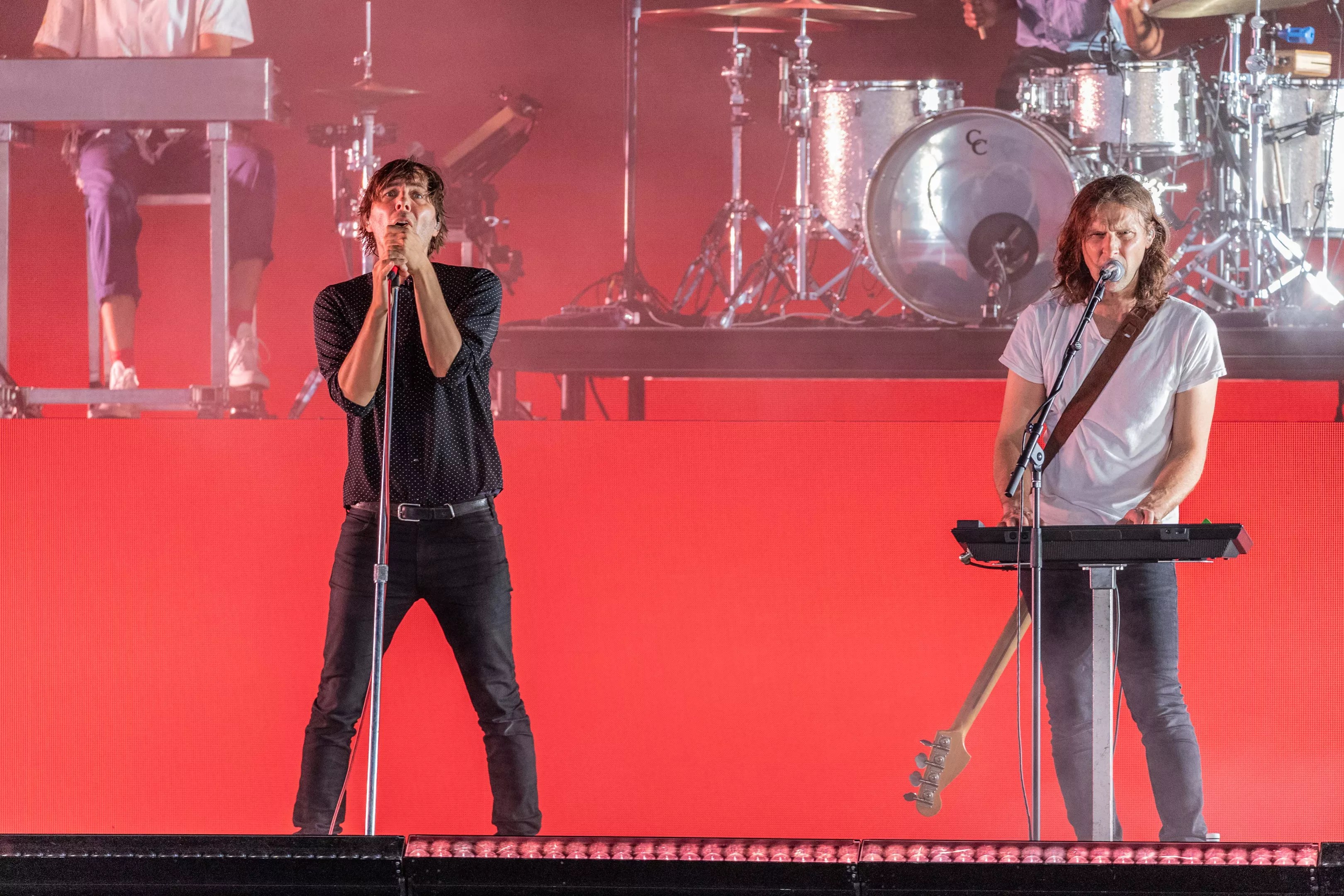 Beck (right) and Phoenix singer Thomas Mars sing “Odyssey.”