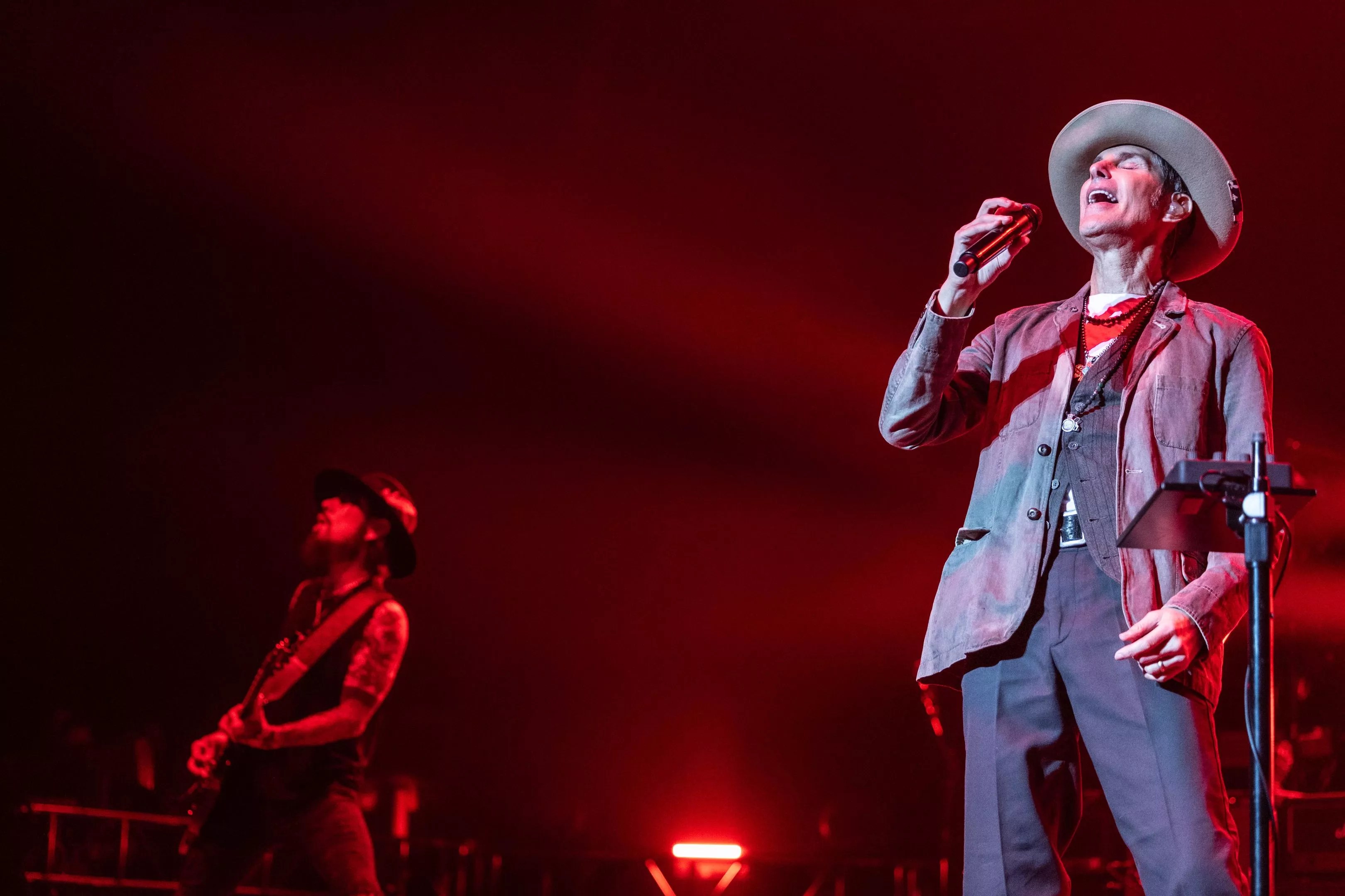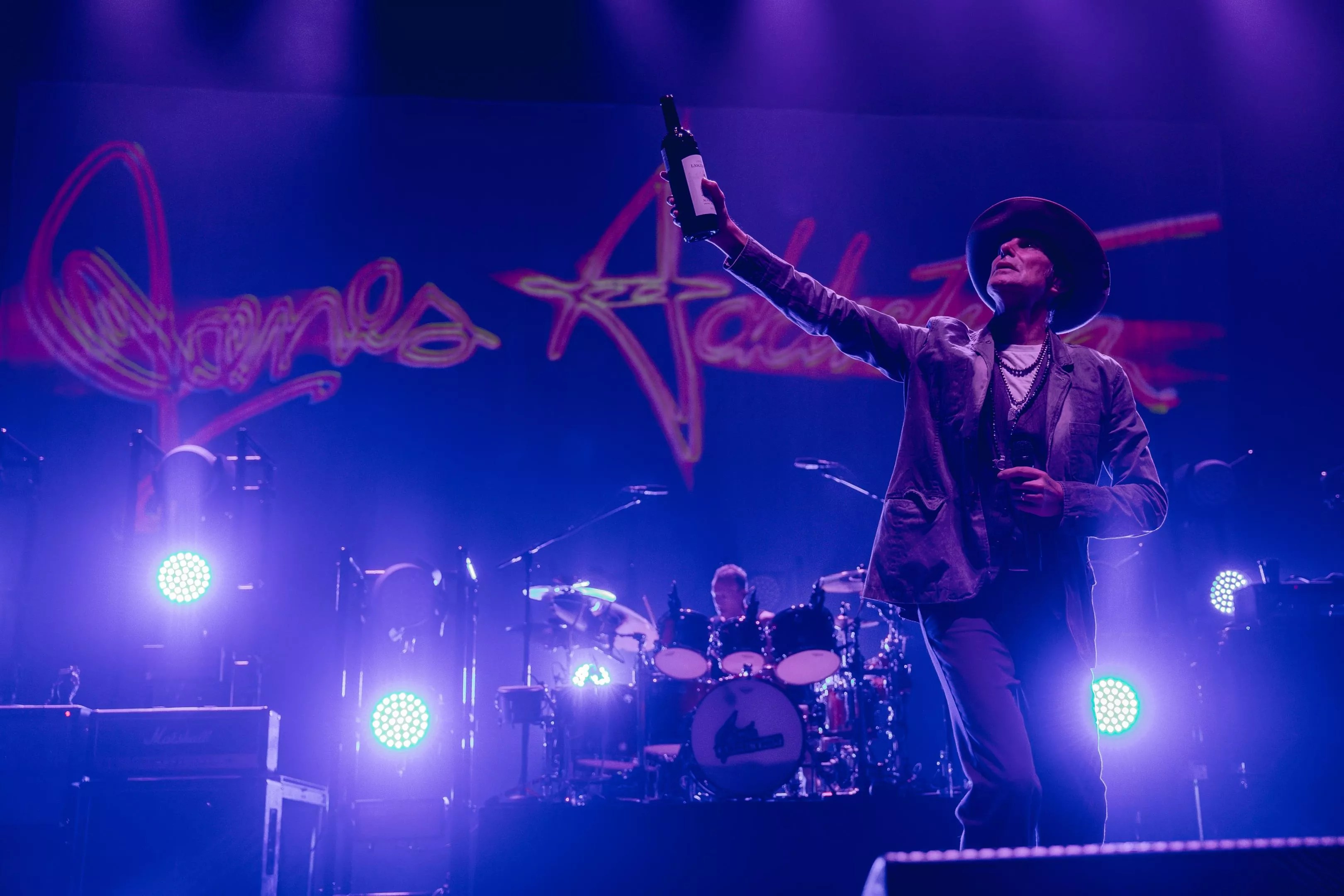 Navarro looked healthy, dressed in all black, donning his eternal black eye makeup and red-feathered bluesman hat. Farrell wore his signature vest and held a bottle of red wine, which he swung back and forth between verses of the opening song, “Kettle Whistle.”
