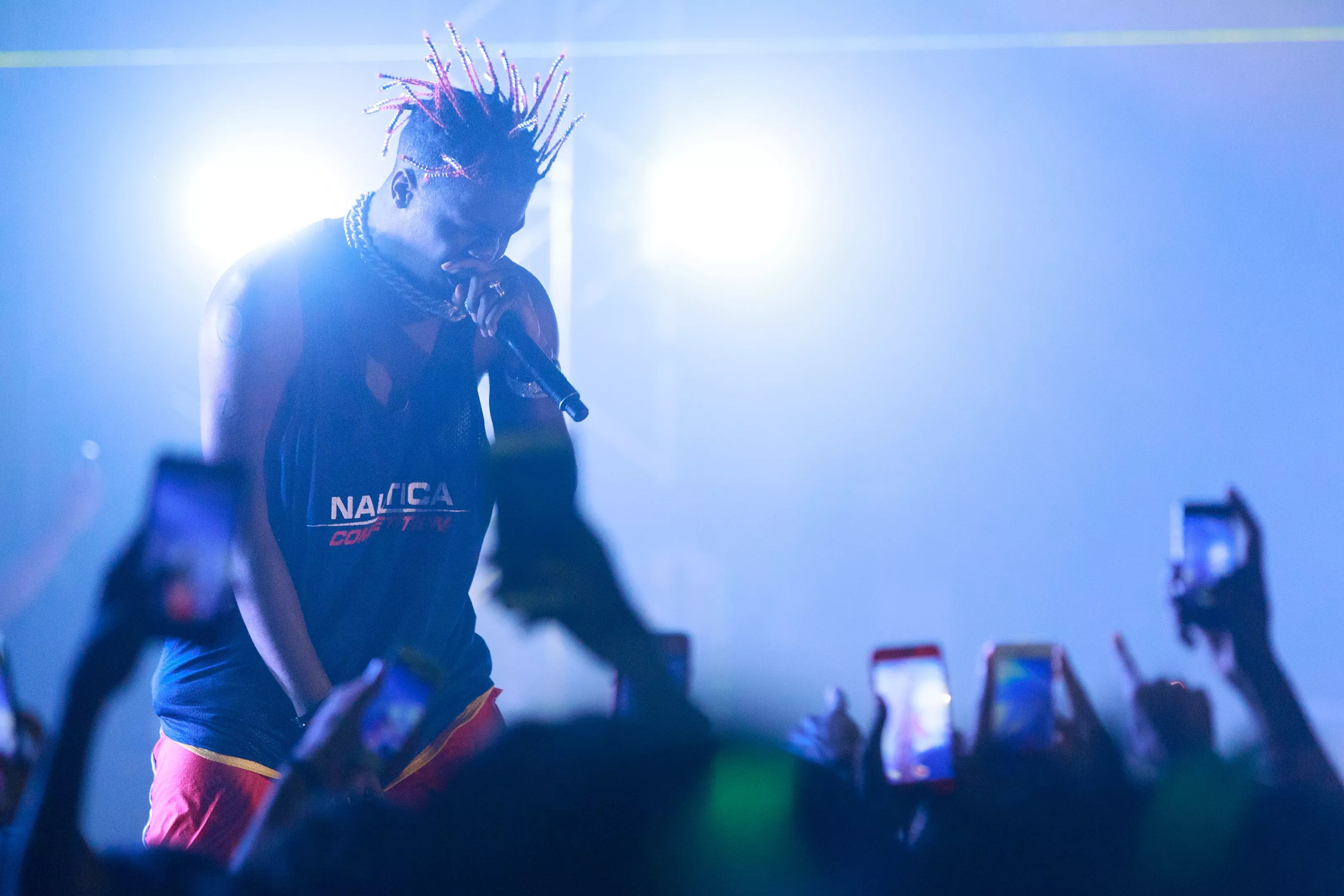 On Friday, he ran out onstage to the opening notes of “Like a Star” wearing a $10,000 pair of self-lacing Nike Air Mag sneakers, like the ones Marty McFly wore in Back to the Future II. His followers went wild. Like most of his catalog, the song is heavy on autotune, and the software helped him to sound just like the record in person.