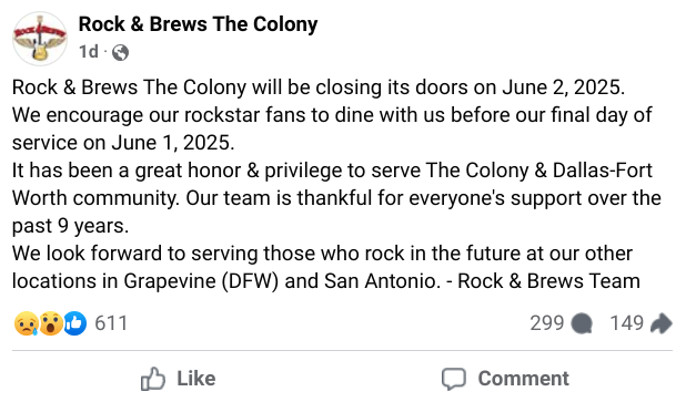 Rock & Brews is closing their location in the Grandscape development in The Colony.