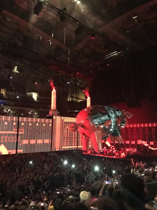 The imagery Waters chose was not subtle. Inflatable pigs circled the arena as he and his band worked their way through “Pigs (Three Different Ones),” broadcasting anti-banking messages while images of President Trump in various comprising positions flashed across the screens.