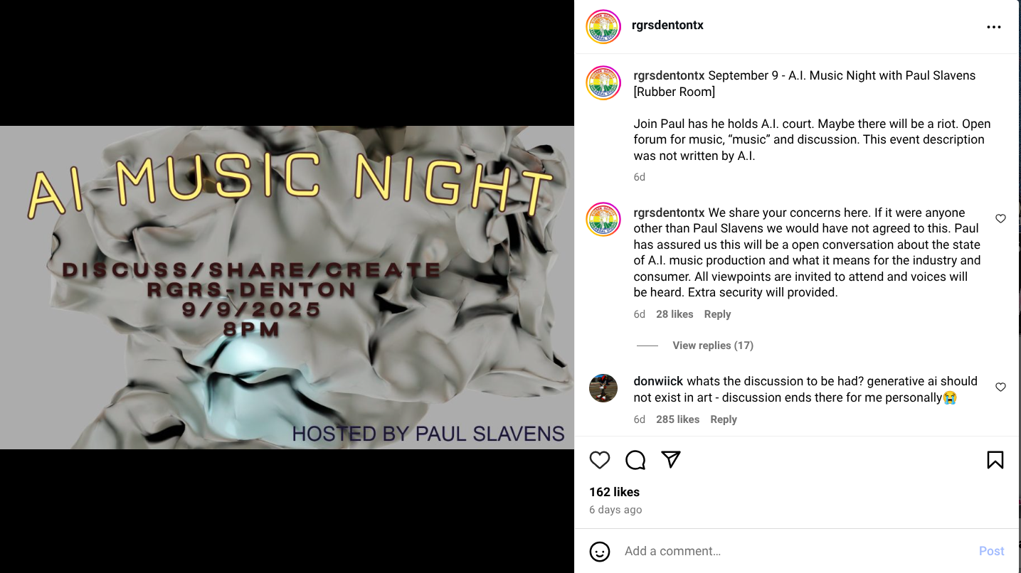 “We share your concerns here,” the comment wrote. “If it were anyone other than Paul Slavens we would not have agreed to this. Paul has assured us this will be a [sic] open conversation about the state of A.I. music production and what it means for the industry and consumer. All viewpoints are invited to attend and voices will be heard. Extra security will [sic] provided.”