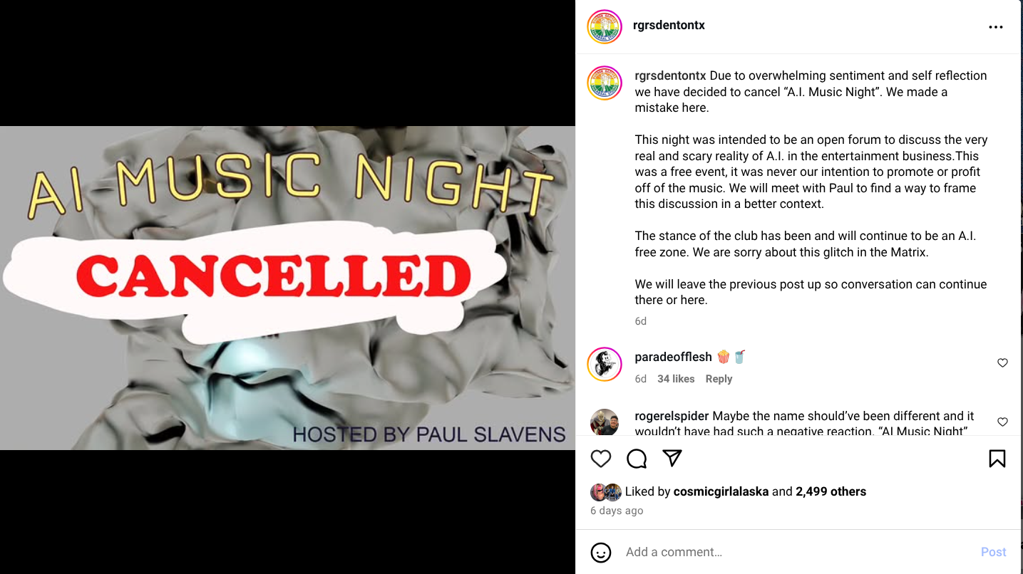 Some commenters rightfully noted that had the event not been called “A.I. Music Night,” the response might not have been so overwhelmingly negative.