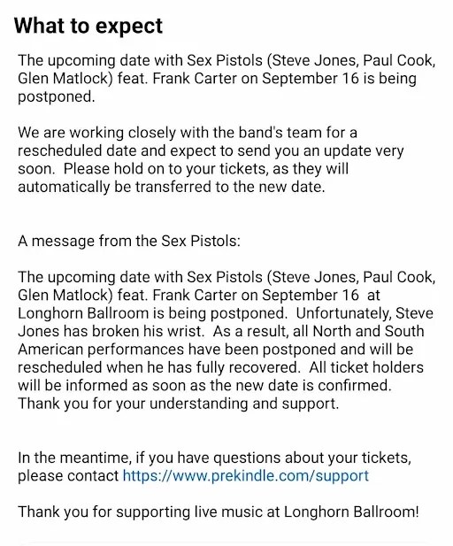 The upcoming date with Sex Pistols (Steve Jones, Paul Cook, Glen Matlock) feat. Frank Carter on Sept. 16 at Longhorn Ballroom is being postponed. Unfortunately, Steve Jones has broken his wrist. As a result, all North and South American performances have been postponed and will be rescheduled when he has fully recovered. All ticket holders will be informed as soon as the new date is confirmed. Thank you for your understanding and support.