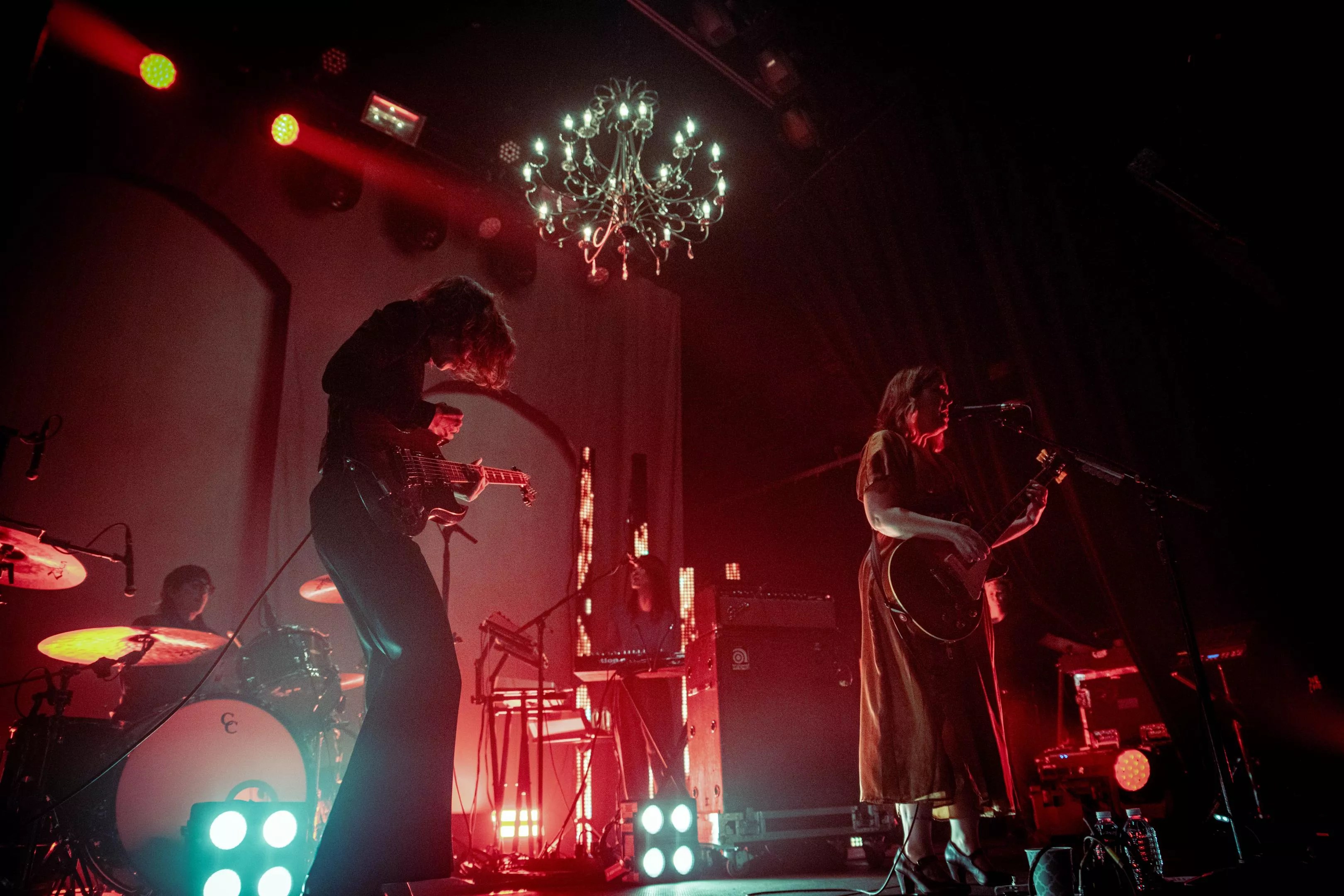 The band came on at 9:12 p.m. to the sound of ominous guitar music, taking the stage one by one with Tucker and Brownstein heading to the front of the stage, backed by keys, synths and drums. Two chandeliers overhead and austere cathedral arches served as the backdrop.
