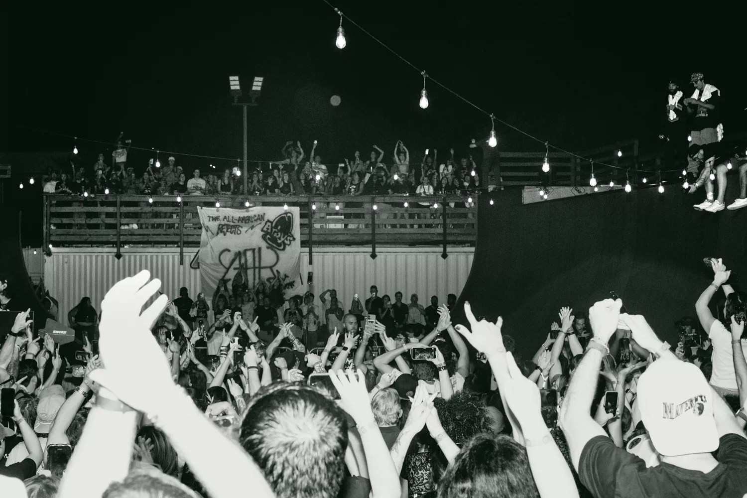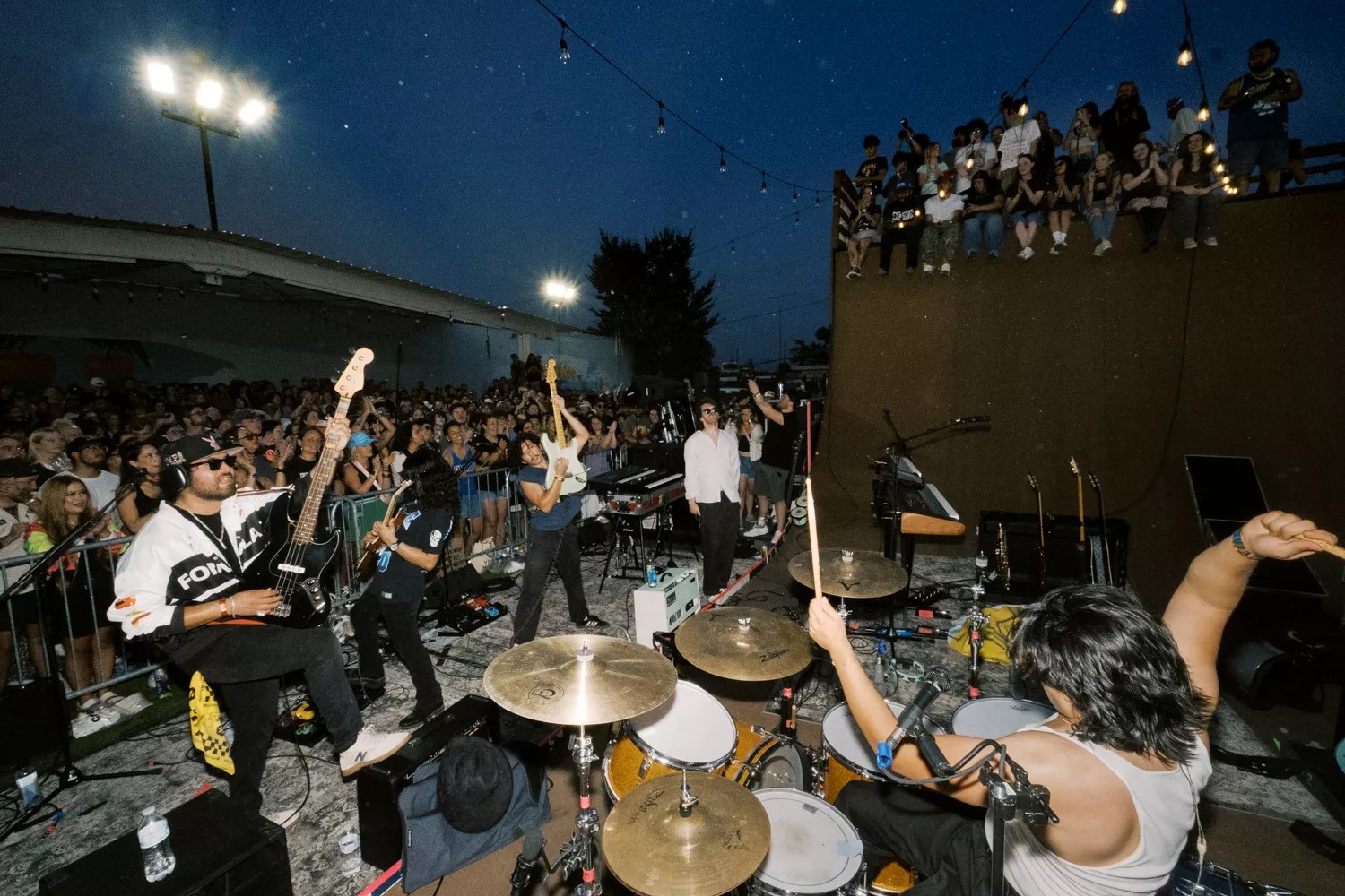 After hours of speculation, the band shared the location on TikTok, and most fans did the same, rushing to the skatepark to stand in line. By the time we got to 4DWN, the line split between ticket holders and hopefuls trying to get in before reaching capacity. It stretched around the block, as many knew this was the show you didn’t want to have FOMO over.