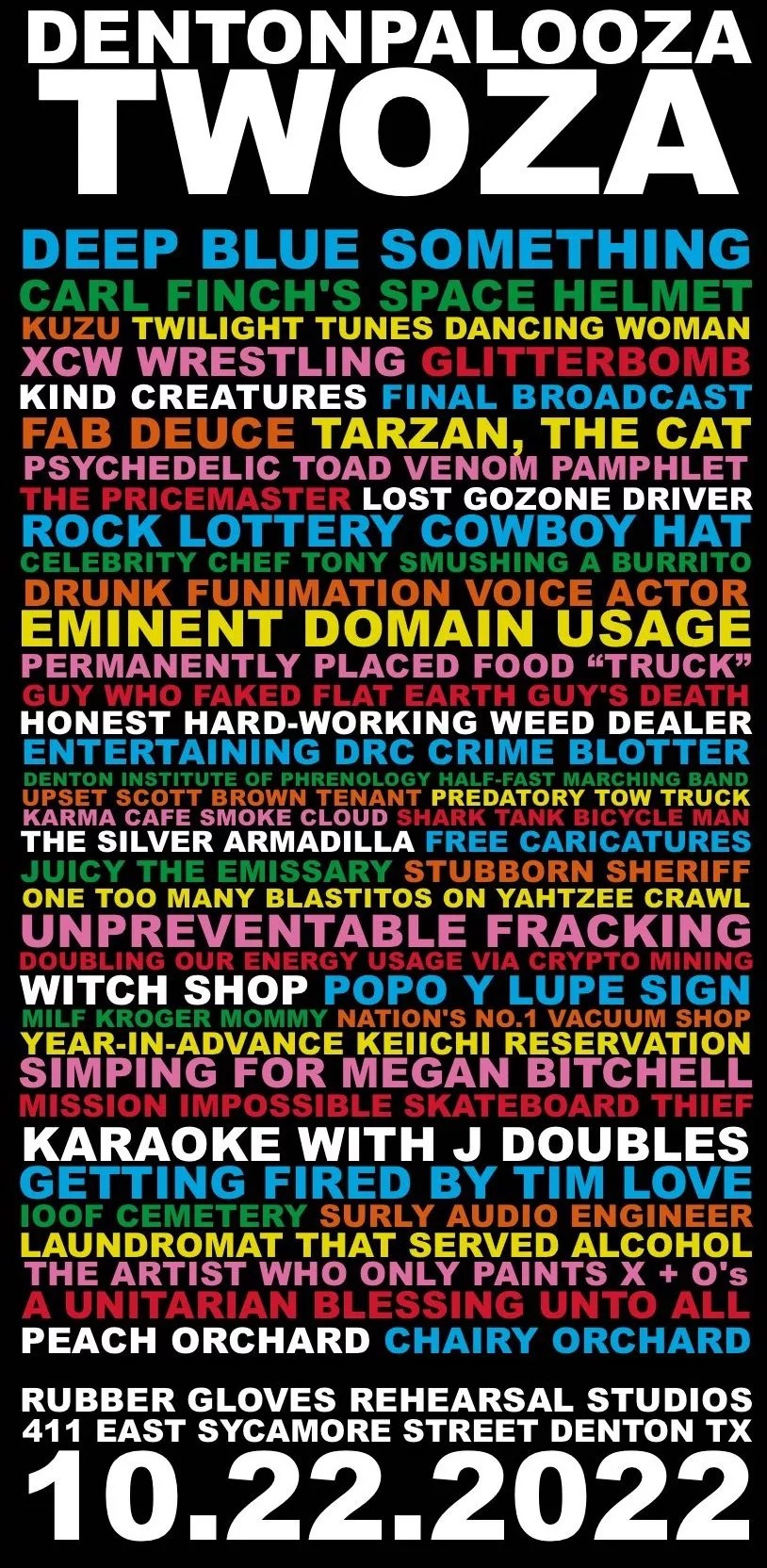 Dentonpalooza Twoza takes place at Rubber Gloves Rehearsal Studios on Oct. 22. Liechty says he hopes to have a link available for purchasing tickets ($20) and T-shirts by the end of the month, as well as a complete schedule of events.