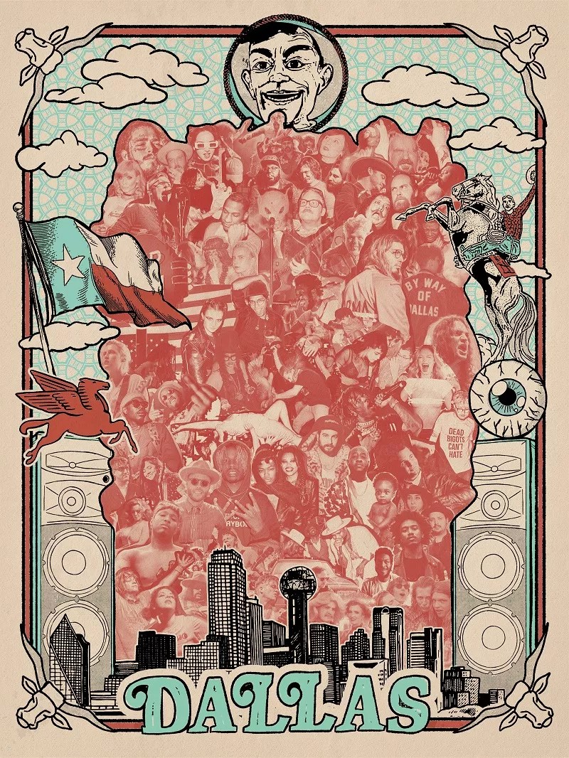 “I wanted to use some classic imagery of Dallas – the skyline, giant eye, Big Tex – but for me being a graphic artist and musician in the scene here, it’s the people who make that scene what it is,” Moehring says. “So I wanted those people to be the main image and show the diversity and eclectic nature of our music scene.”