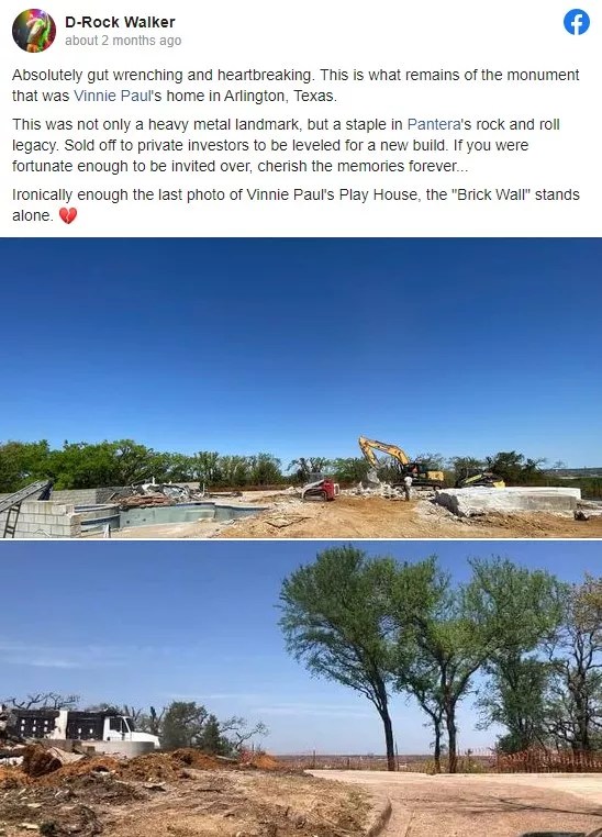 “Absolutely gut wrenching and heartbreaking,” wrote former deejay Derek “D-Rock” Walker on a Facebook post with two photos of the remaining rubble that’s since been taken down from the web. “This is what remains of the monument that was Vinnie Paul’s home in Arlington, Texas. This was not only a heavy metal landmark but a staple in Pantera’s rock and roll legacy.”