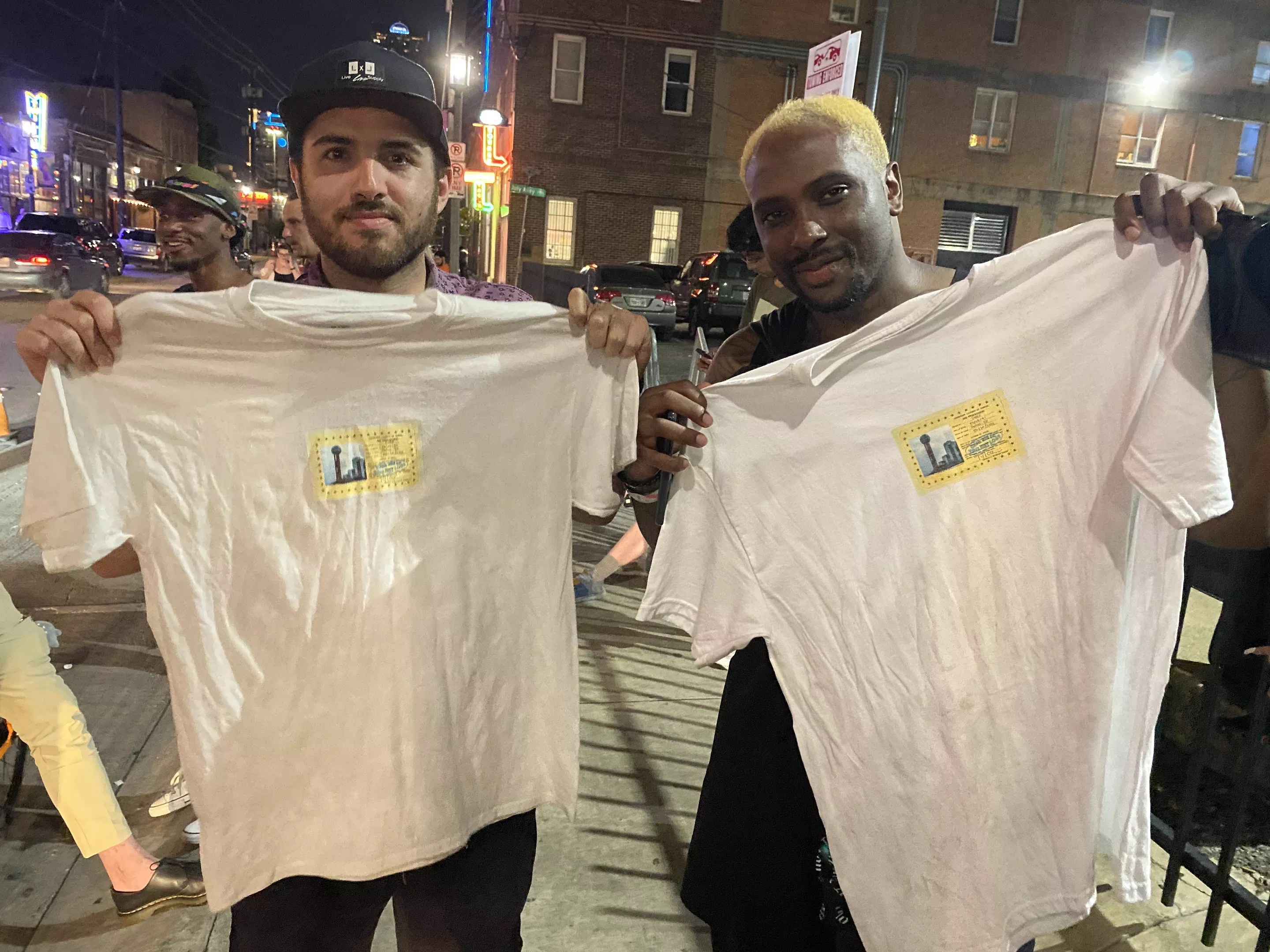 Tyler, the Creator fans Joel Olivas and Charles Smith II show off their exclusive merch outside of Trees.