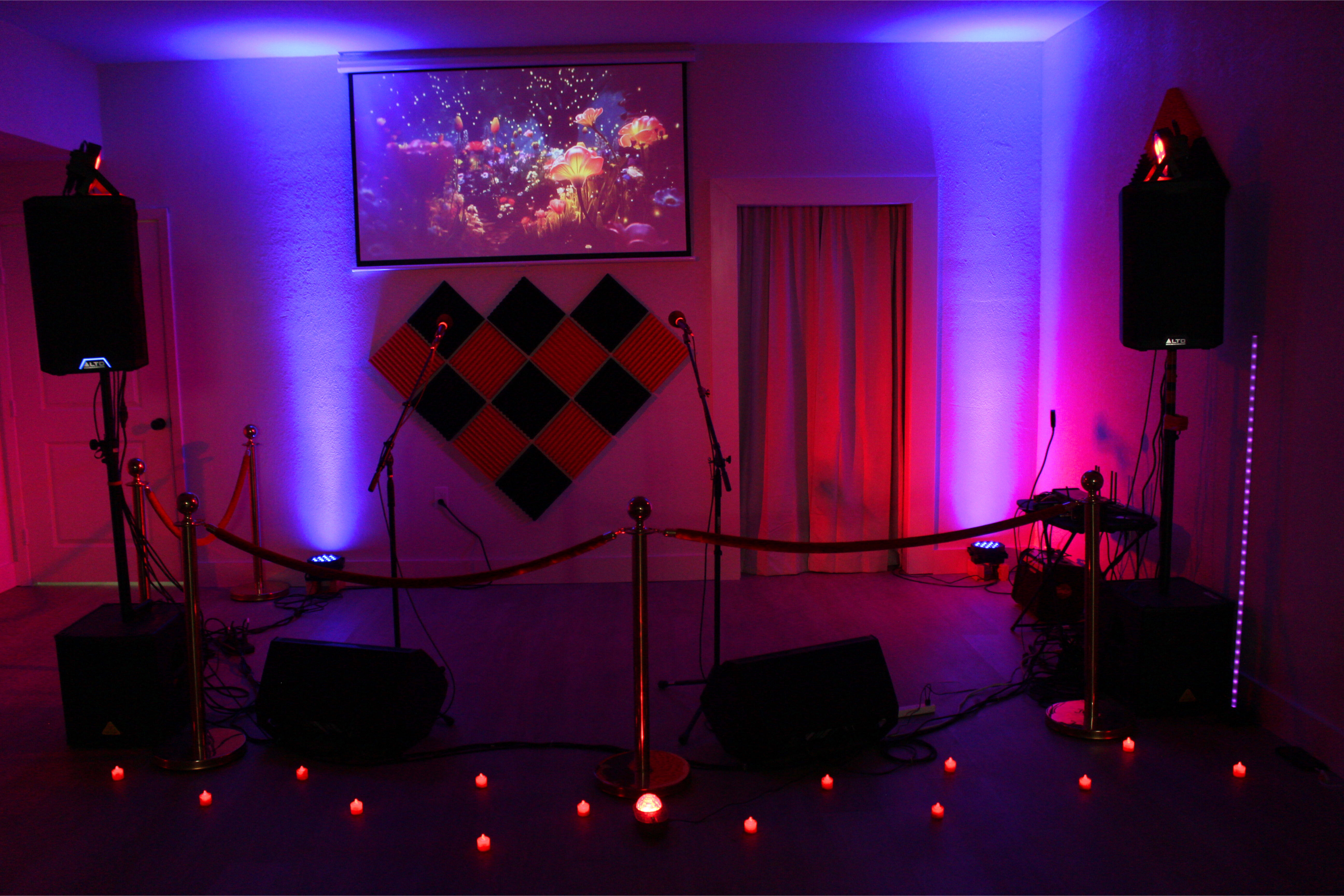 There’s a small stage in the back of the room, equipped with a PA and stage lights. To the left, it has cushy theater seating for watching the shows. To the right is a photography bay with pull-down backdrops and lighting gear. In the front of the room by the door, there are three chairs and microphones, resembling a mini-podcast studio. It’s as if every inch of the room is being put to good use. It all presents as very clean and well-organized, a rarity for hubs of underground art.