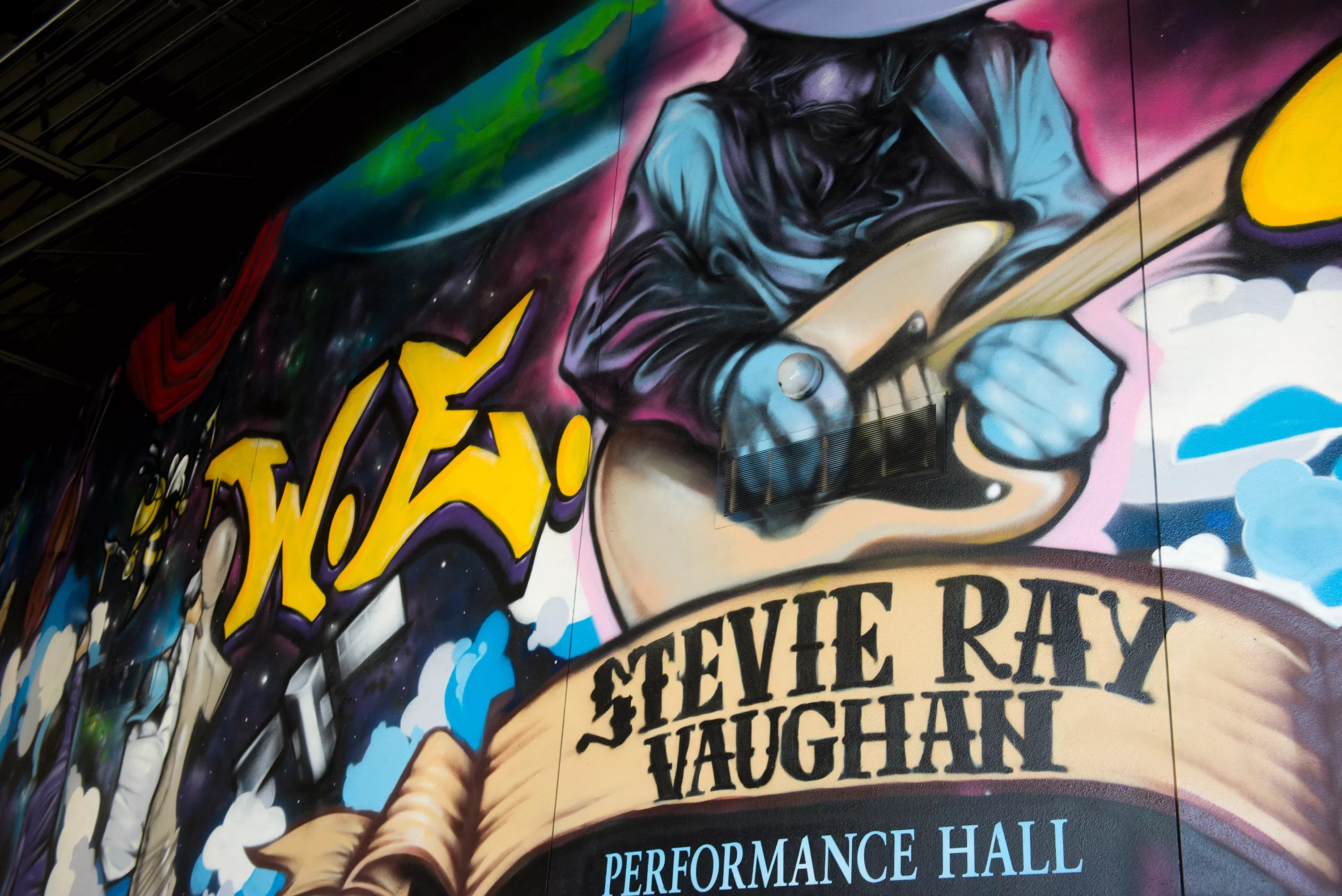 A Stevie Ray Vaughan mural adorns the wall above the entrance to the performance hall at Greiner Exploratory Arts Academy in Oak Cliff.