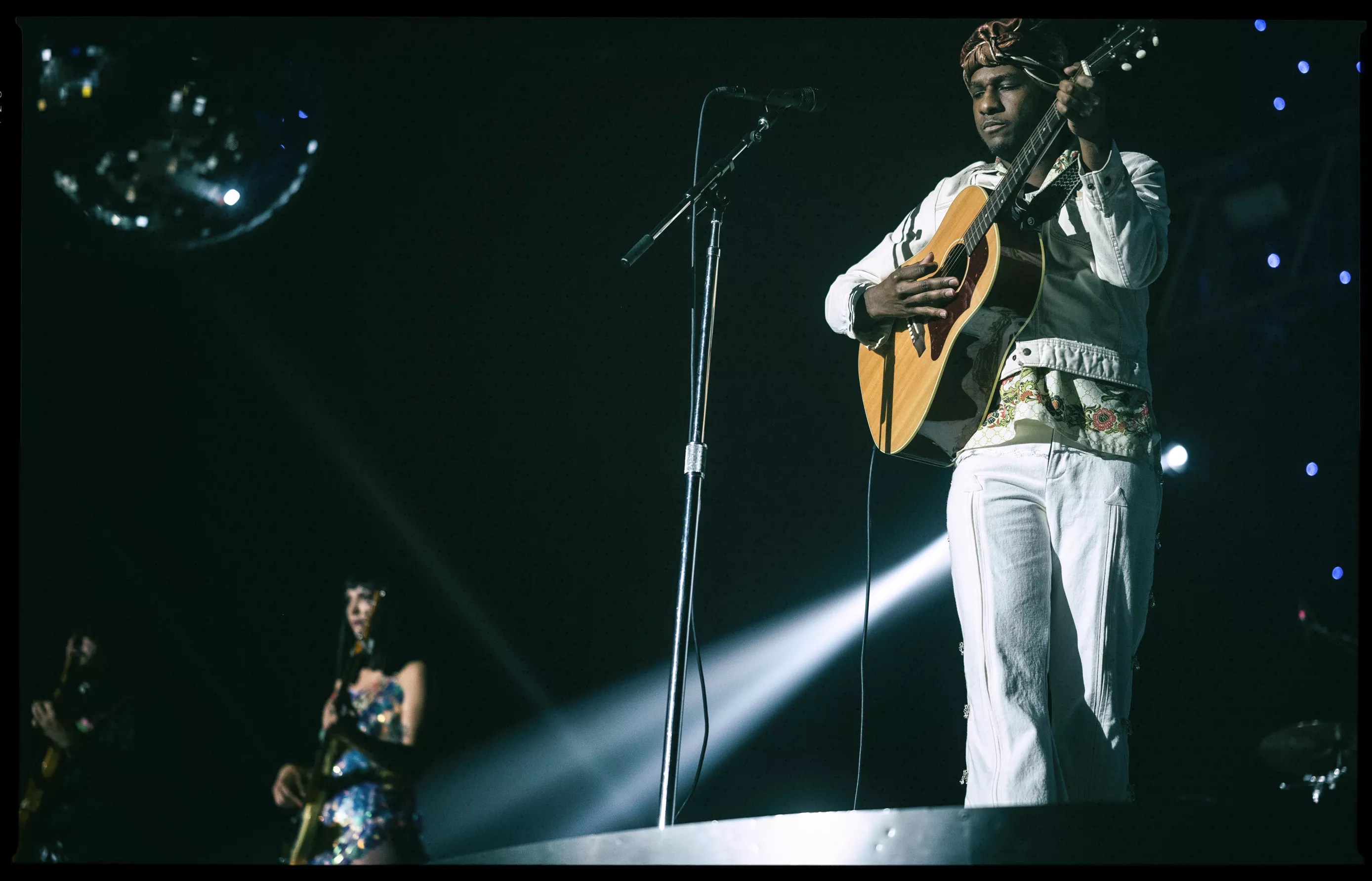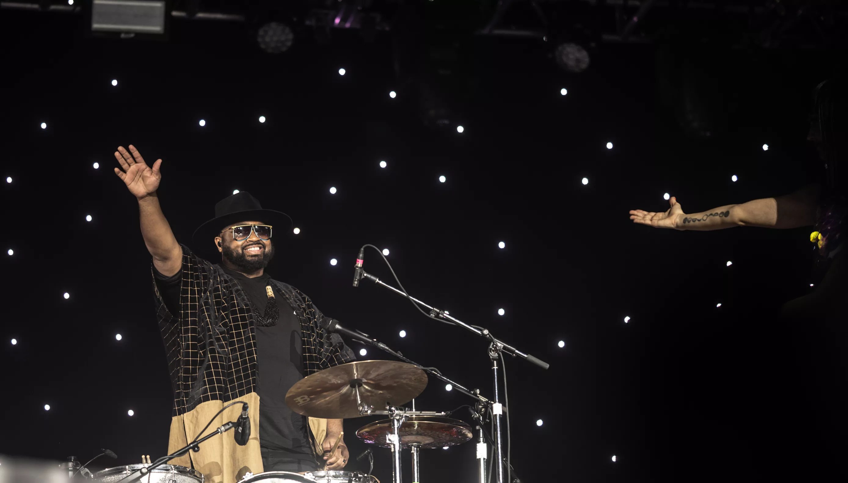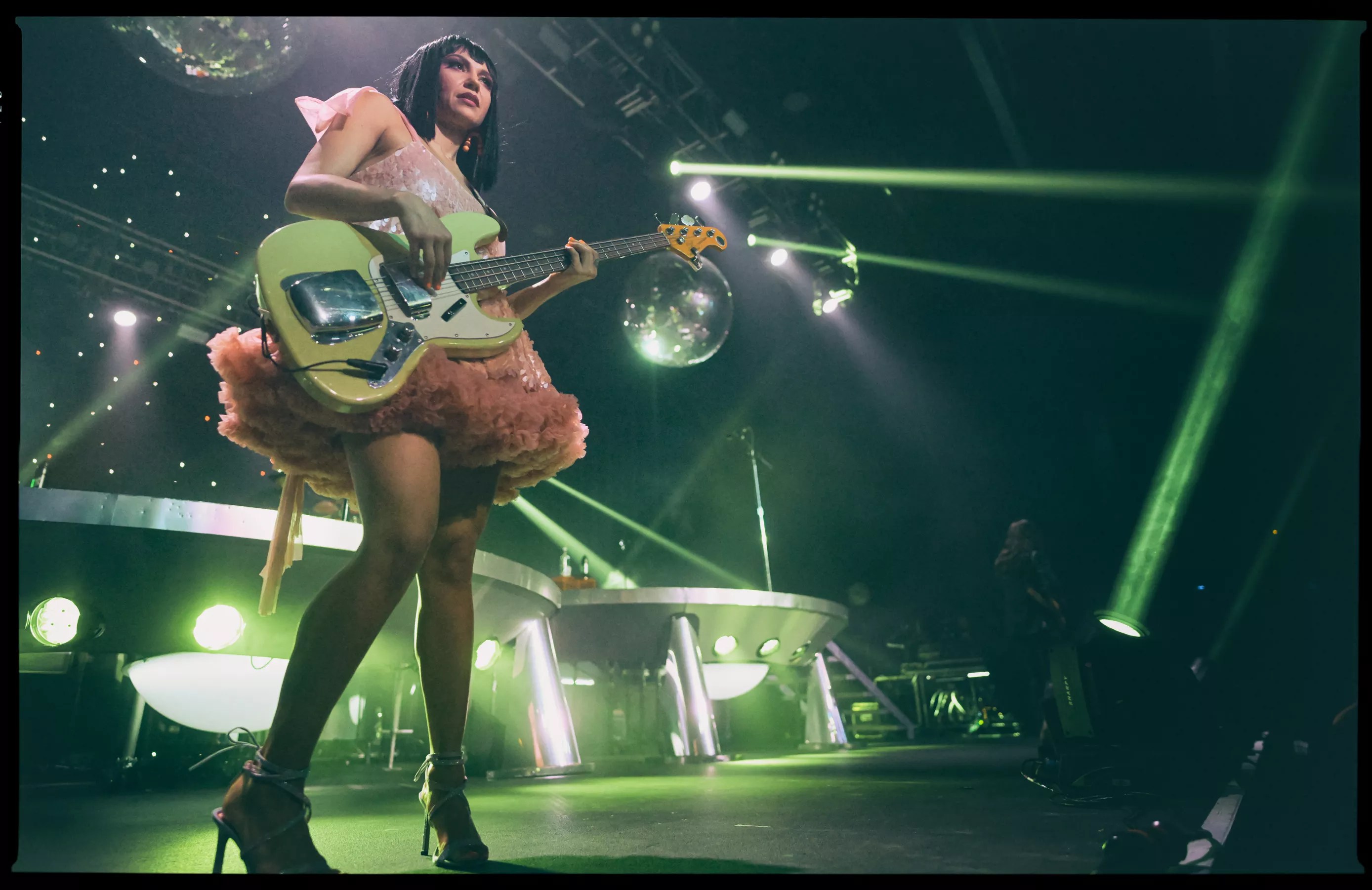 Situated atop three enormous platforms, which resembled the lower halves of mid-century modern-styled spacecraft, the musicians were surrounded by light, whether blaring spots ricocheting off mammoth disco balls, or pin-prick glittering, arrayed across a curtain draping the back of the stage. The cumulative effect often felt like floating – Khruangbin’s mastery of hypnotic grooves, the sound and sensation of three distinct instruments locked together yet dancing around one another is intoxicating.