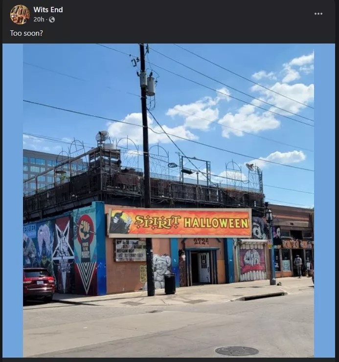 The Wits End Facebook page announced its closing with a photo of the building with a Spirit Halloween store banner plastered over its sign.