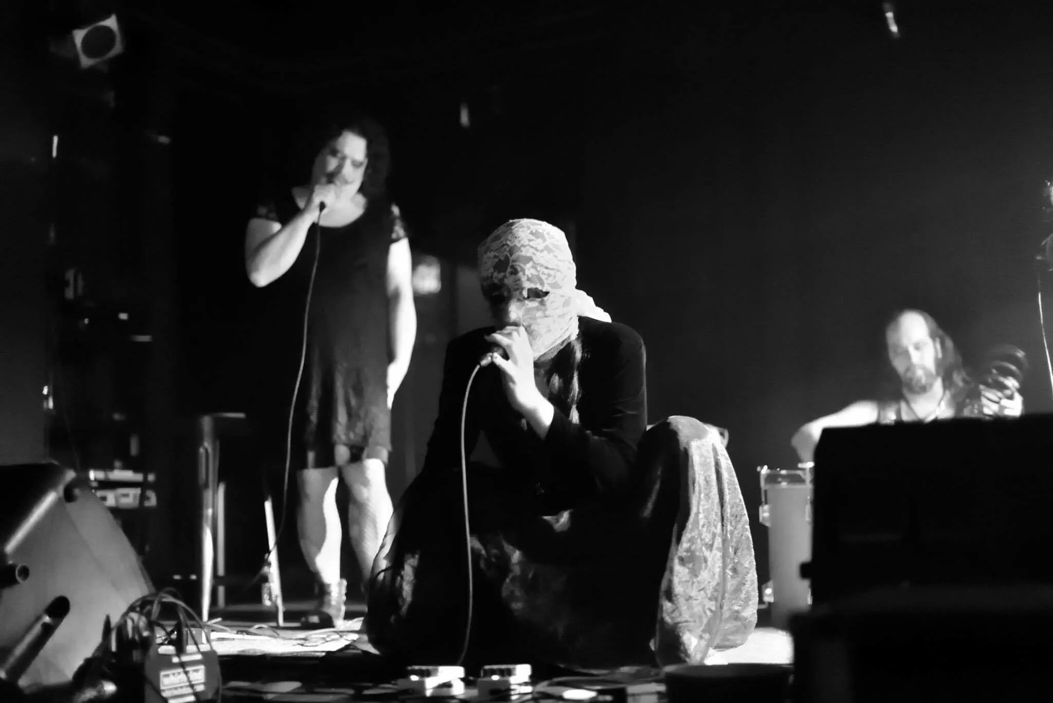 The band started out a year and a half ago as a solo project by avant-garde musician Wyatt Rosser. He takes the stage in a long black gown, his face covered in white lace that’s tied at the back, with holes ripped out at his eyes and mouth like a balaclava, revealing generous smears of red lipstick and black eye makeup that have bled into the lace.