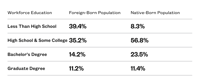 3) The percentage of immigrants with graduate degrees is nearly the same as the native-born population in DFW.