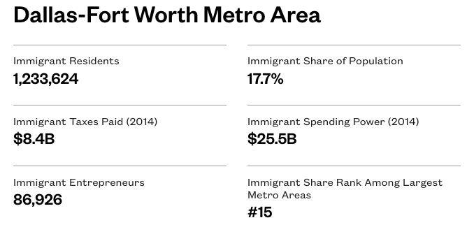The report traces the impact of the 1.23 million immigrants in the DFW metro area, which ranks as number 15 nationwide. While the region ranks number 15 in terms of immigrants, the state is home to nearly 4.5 million immigrants, the second-largest population of immigrants in the country behind California.
