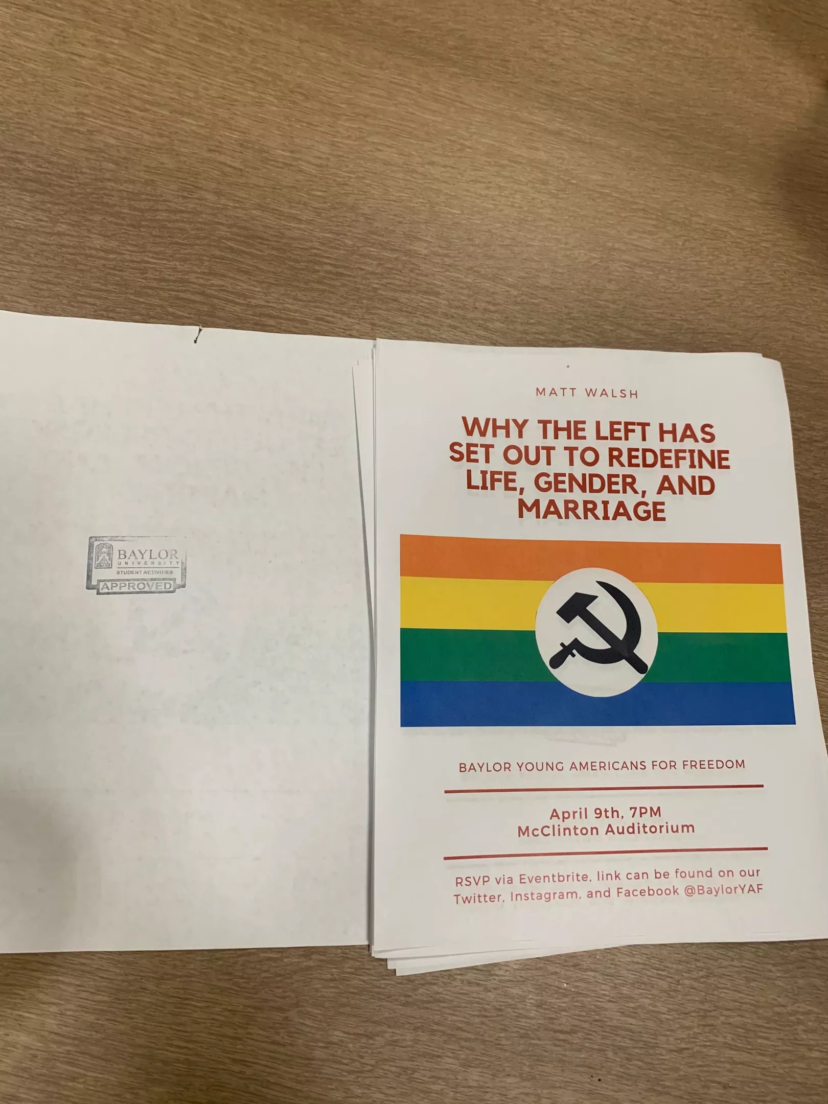 But Conner, 21, said unequal treatment of LGBTQ students has persisted since then. In April, Baylor Young Americans for Freedom, a university-approved conservative student group, hosted a lecture by Matt Walsh, a commentator for the conservative website The Daily Wire. Walsh’s speech was titled “Why the Left Has Set Out to Redefine Life, Gender and Marriage.” The group posted promotional flyers on campus bearing the LGBTQ rainbow flag with a hammer and sickle superimposed over it.