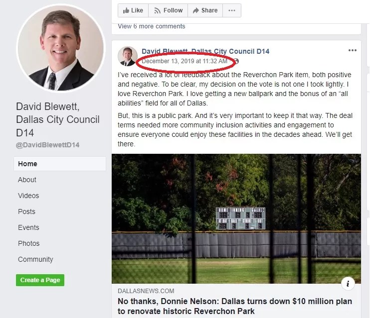 Two days after the Dallas City Council in a split vote shot down a deal to turn over Reverchon Park to a for-profit sports entity, East Dallas District 14 City Council member David Blewett, who had voted against the giveaway, filed paperwork with the city secretary for a revote on the deal. Blewett didn’t say in his memo he intended to change his vote, but it’s hard to imagine why a guy on the winning side would want a do-over unless he changed his mind.