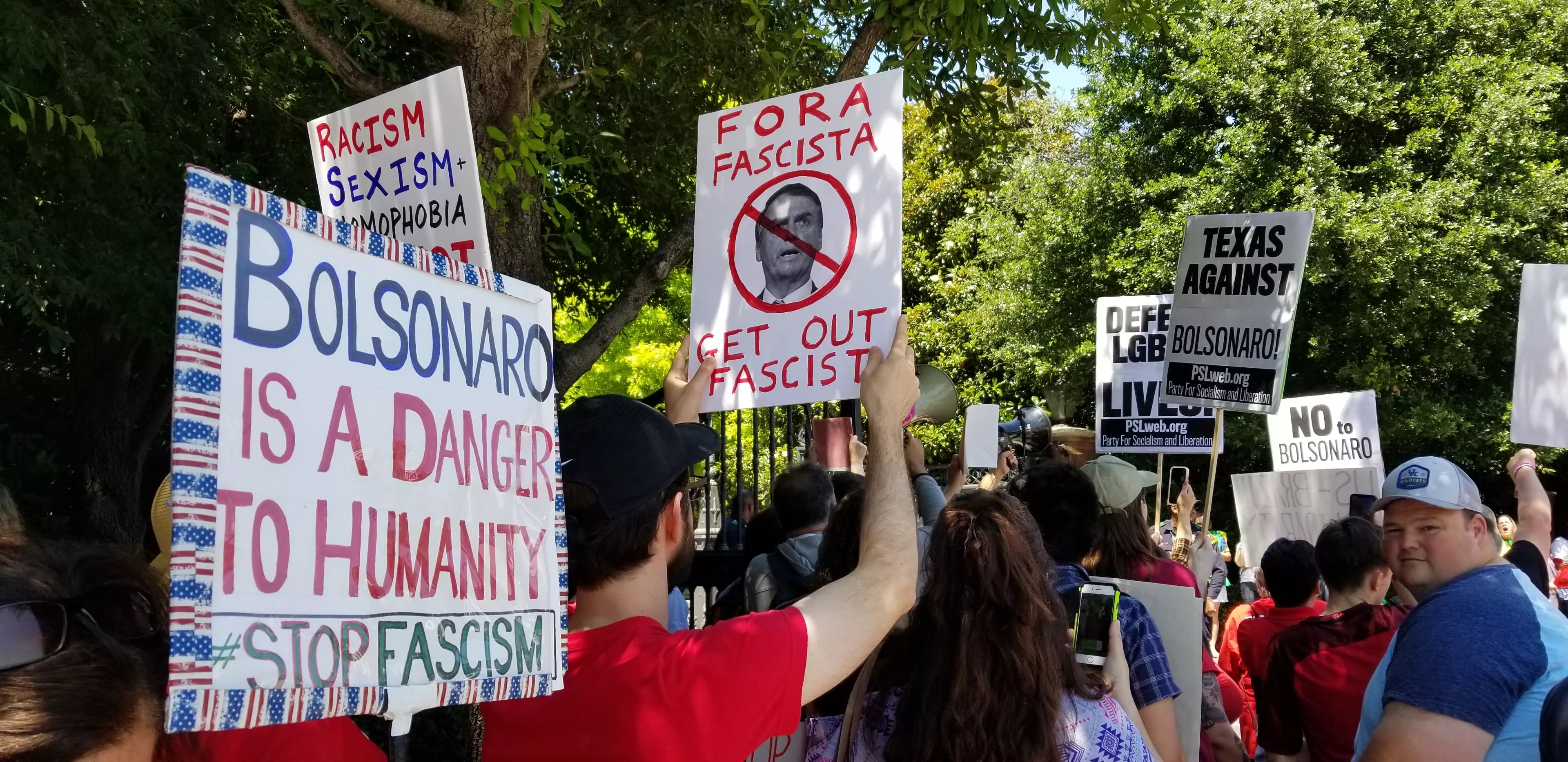 While Brazilian President Jair Bolsonaro spoke with Dallas business leaders Thursday at the Old Parkland hospital campus, dozens of demonstrators lined the street outside, some denouncing him as a fascist despot and others welcoming him to Texas.