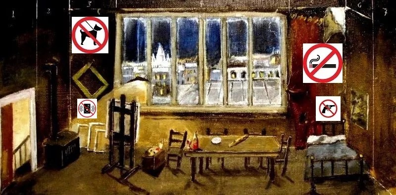 Apologies to Reginald Gray, La Boheme Scene One, via Wikipedia, signs from Shutterstock