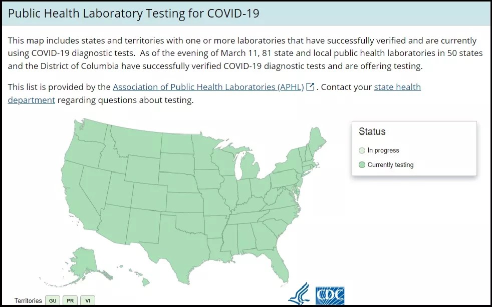 Under the legend, “Public Health Laboratory Testing for COVID-19,” the CDC page showed me a map of America. No dots, no push-pins or little flags to show where the labs are, just America. The whole country.