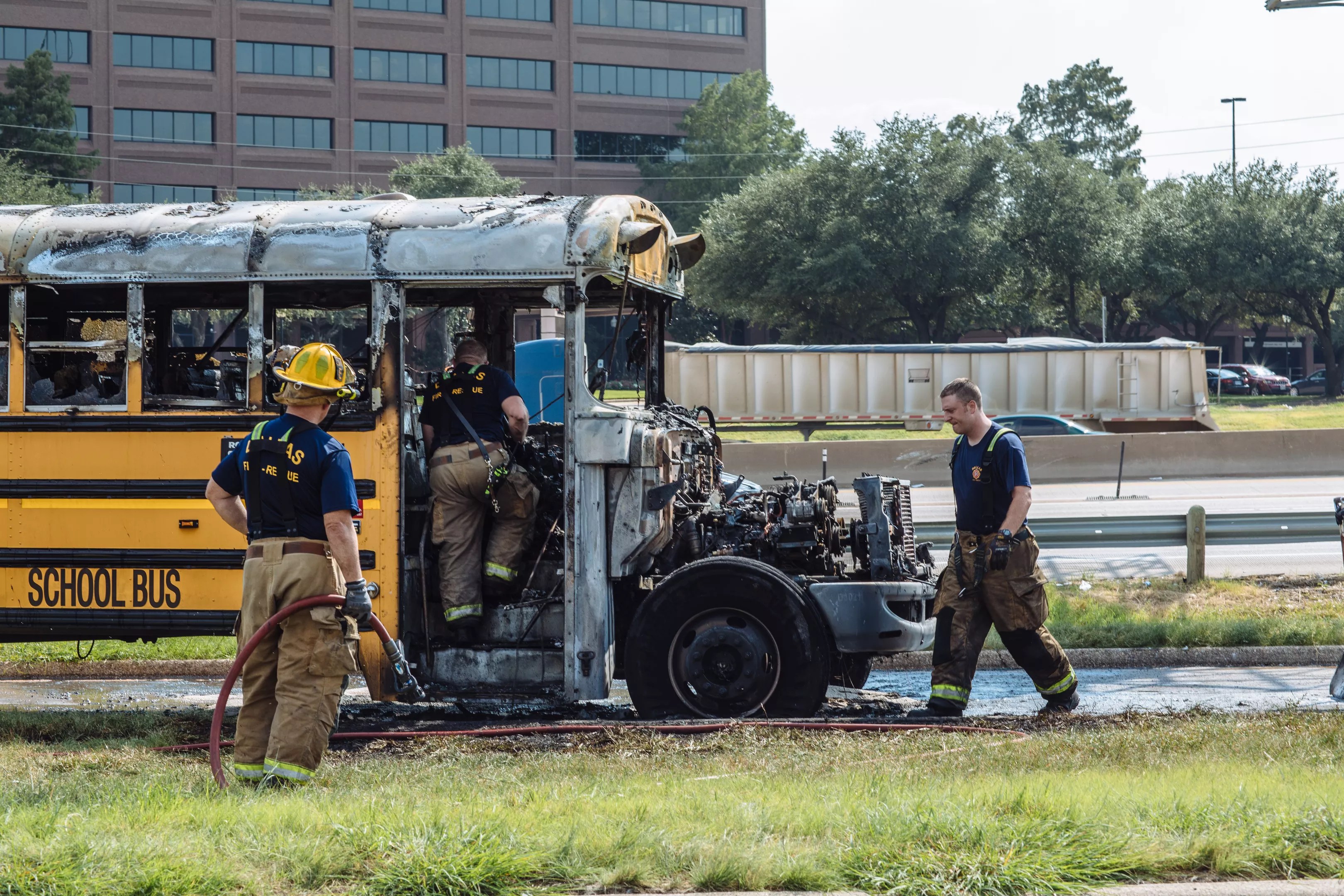 A Dallas County Schools spokesperson said no children were on the bus. The front half of the bus was ablaze, burning out the windows and melting some of the metal around the tires and frame.