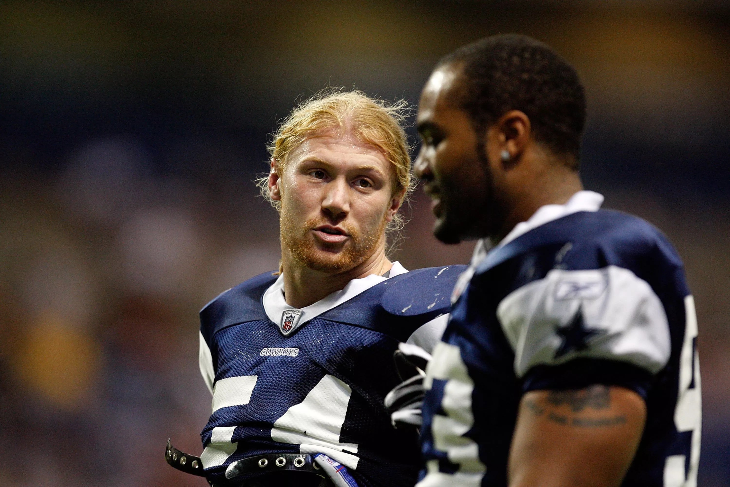 Bobby Carpenter chats with a teammate during Cowboys training camp in 2009.