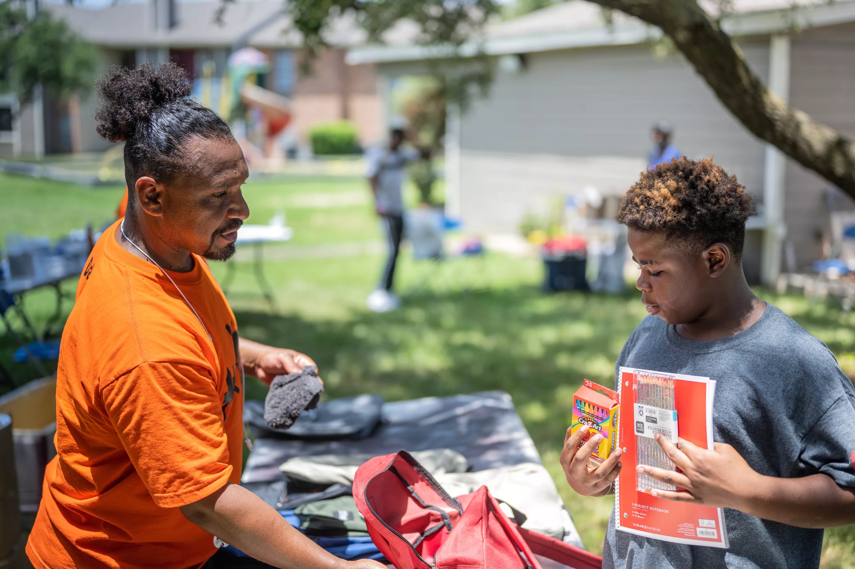 Victor Alvelais offers a young man a backpack and supplies at Chaucer Place Apartments in South Dallas.