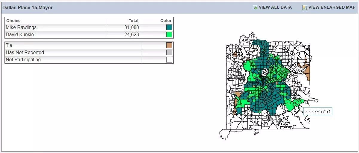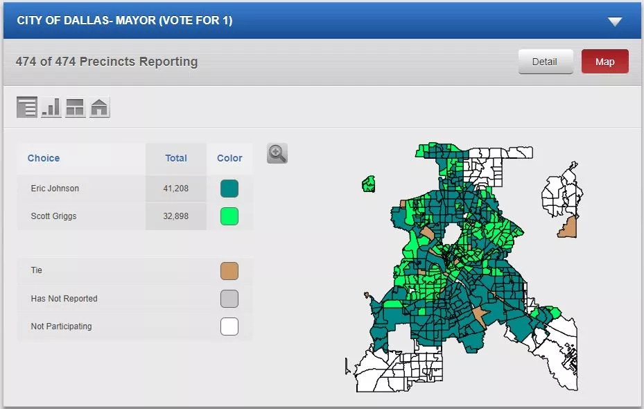 One look at the vote distribution map in the mayor’s race, and it’s easy to see the narrative of the election. Griggs, the nominal progressive in the race, won the core of the city, including his home neighborhood of North Oak Cliff, the areas surrounding downtown Dallas and much of East Dallas. Johnson won the election by harvesting hundreds of votes from Dallas’ last remaining GOP stronghold in the area just north of the Park Cities and steamrolling Griggs in South Dallas and South Oak Cliff, following the old-school Dallas path to mayoral victory that’s been walked by the likes of Ron Kirk and outgoing Mayor Mike Rawlings.