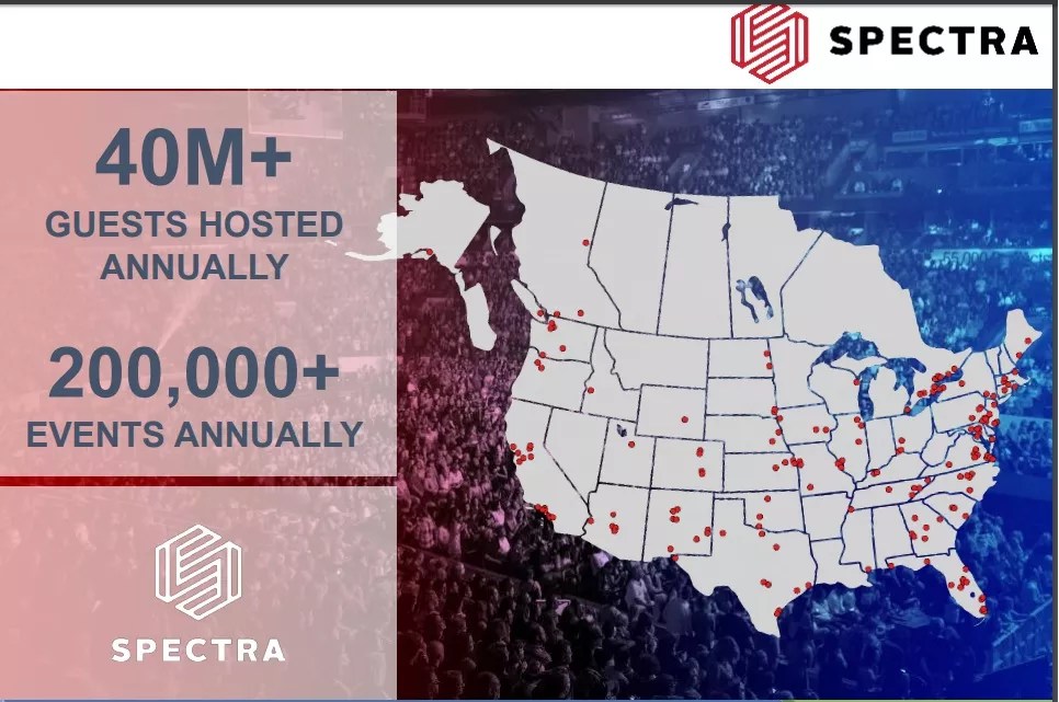 Spectra is a division of Comcast, a telecommunications company with $4.3 billion a year in cash flow. Other Comcast subsidiaries are NBC, NBCUniversal, Xfinity and Telemundo. Spectra runs 319 properties around the nation, including 22 fairgrounds, 124 arenas, 50 convention centers and 37 amphitheaters. It claims to host 40 million people annually at 200,000 events.