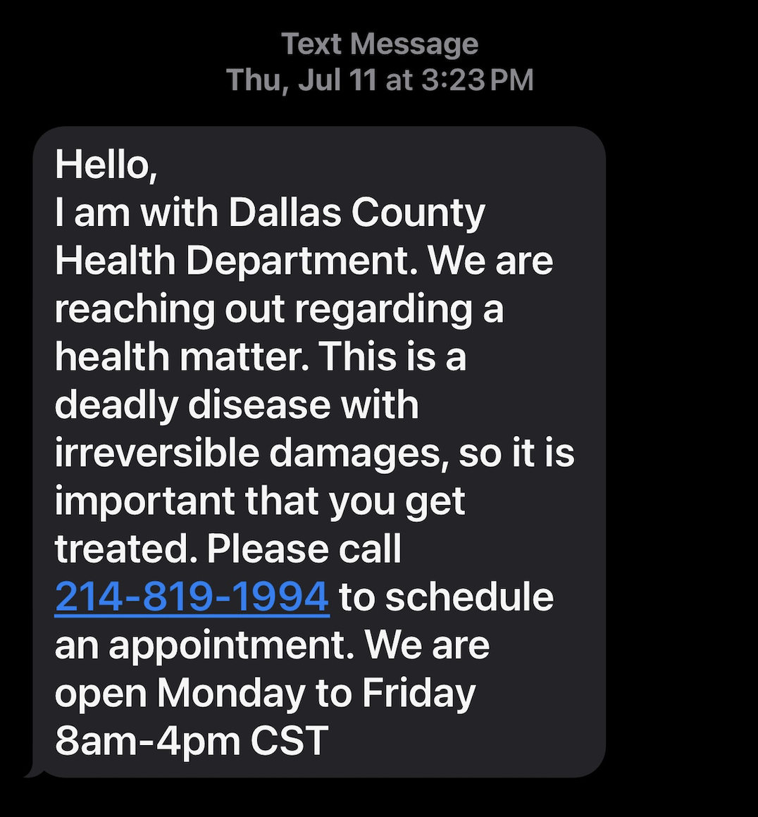 “Hello, I am with the Dallas County Health Department,” a message shared with the Observer reads. “We are reaching out regarding a health matter. This is a deadly disease with irreversible damages, so it is important that you get treated.”